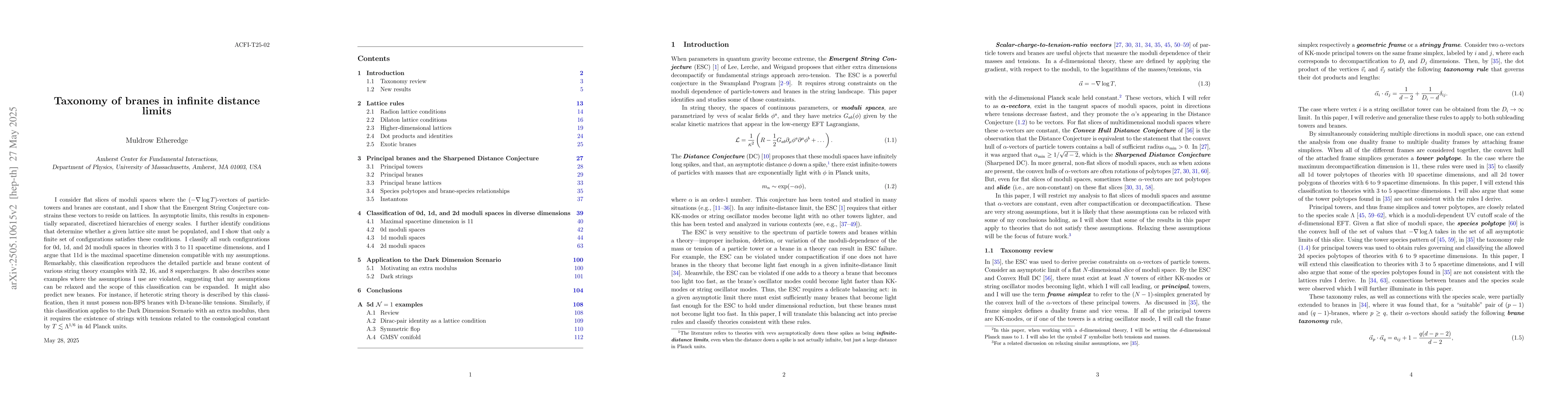 I consider flat slices of moduli spaces where the $(-\nabla \log T)$-vectors of particle-towers and branes are constant, and I show that the Emergent String Conjecture constrains these vectors to reside on lattices. In asymptotic limits, this results in exponentially separated, discretized hierarchies of energy scales. I further identify conditions that determine whether a given lattice site must be populated, and I show that only a finite set of configurations satisfies these conditions. I classify all such configurations for 0d, 1d, and 2d moduli spaces in theories with 3 to 11 spacetime dimensions, and I argue that 11d is the maximal spacetime dimension compatible with my assumptions. Remarkably, this classification reproduces the detailed particle and brane content of various string theory examples with 32, 16, and 8 supercharges. It also describes some examples where the assumptions I use are violated, suggesting that my assumptions can be relaxed and the scope of this classification can be expanded. It might also predict new branes. For instance, if heterotic string theory is described by this classification, then it must possess non-BPS branes with D-brane-like tensions. Similarly, if this classification applies to the Dark Dimension Scenario with an extra modulus, then it requires the existence of strings with tensions related to the cosmological constant by $T\lesssim \Lambda^{1/6}$ in 4d Planck units.