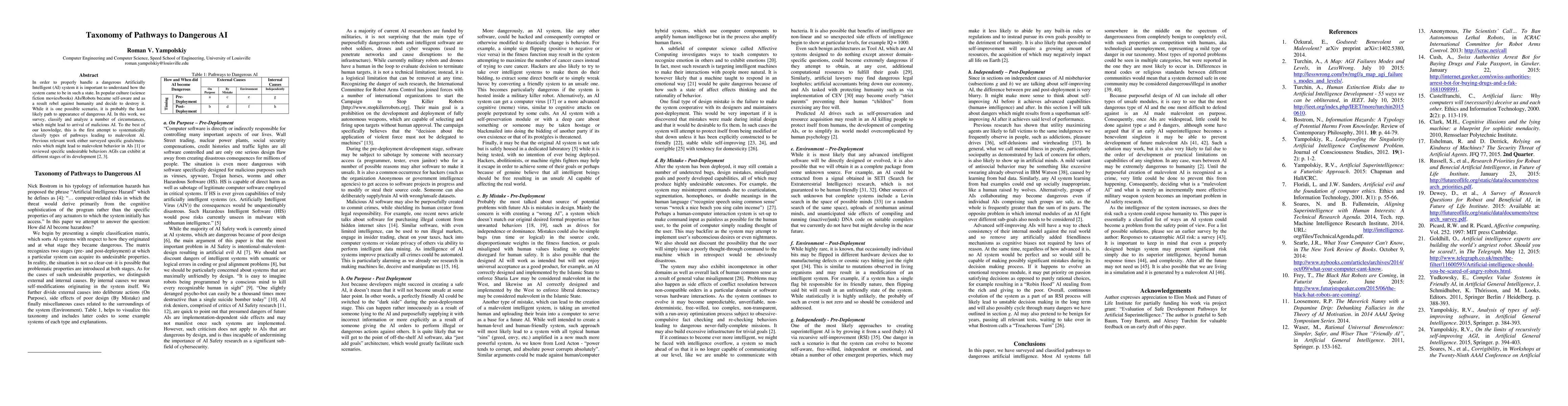 In order to properly handle a dangerous Artificially Intelligent (AI) system it is important to understand how the system came to be in such a state. In popular culture (science fiction movies/books) AIs/Robots became self-aware and as a result rebel against humanity and decide to destroy it. While it is one possible scenario, it is probably the least likely path to appearance of dangerous AI. In this work, we survey, classify and analyze a number of circumstances, which might lead to arrival of malicious AI. To the best of our knowledge, this is the first attempt to systematically classify types of pathways leading to malevolent AI. Previous relevant work either surveyed specific goals/meta-rules which might lead to malevolent behavior in AIs (\"Ozkural, 2014) or reviewed specific undesirable behaviors AGIs can exhibit at different stages of its development (Alexey Turchin, July 10 2015, July 10, 2015).