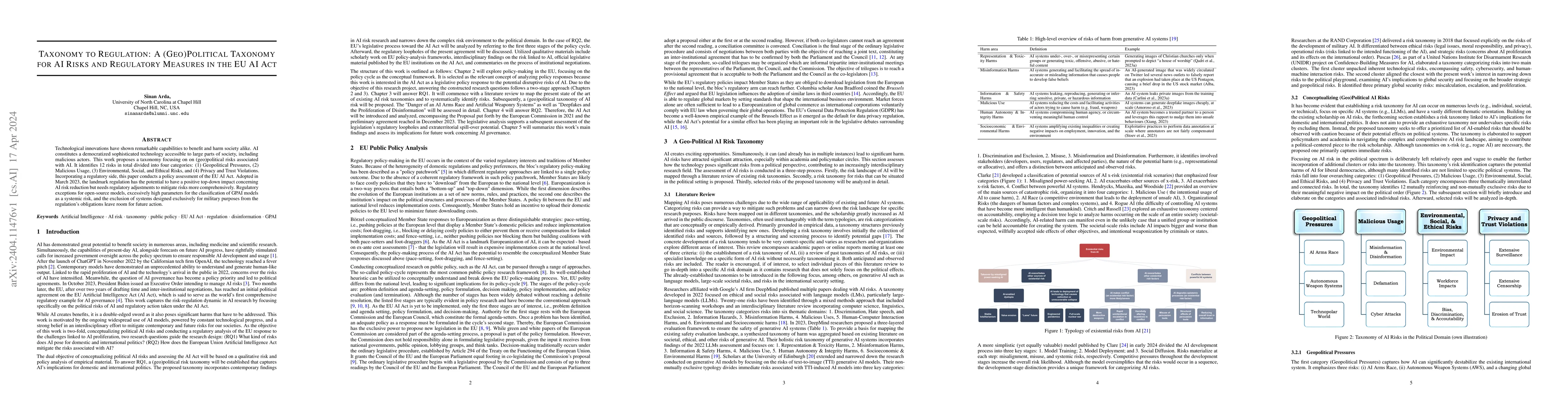 This paper proposes a taxonomy categorizing 12 (geo)political risks of AI into geopolitical pressures, malicious usage, environmental/ethical issues, and privacy violations. It evaluates the EU AI Act, noting its potential for risk reduction but identifying areas for improvement, such as regulatory gaps in open-source models and military applications.