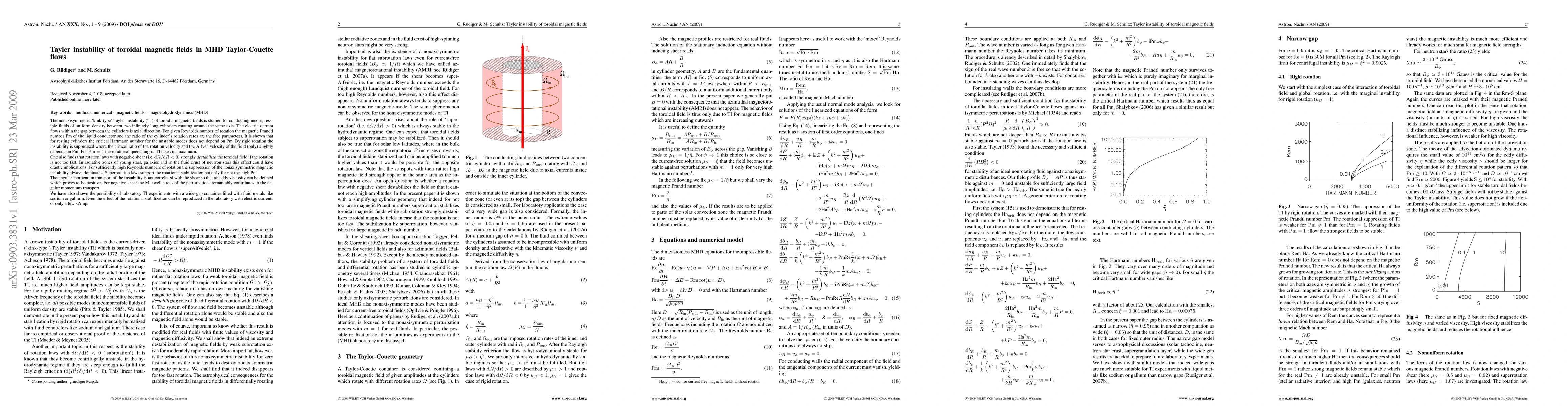 This paper investigates the Tayler instability in toroidal magnetic fields within MHD Taylor-Couette flows, demonstrating that rigid rotation suppresses the instability, with maximum suppression for Pm=1. The study also suggests the feasibility of laboratory experiments using fluid metals to replicate these effects.