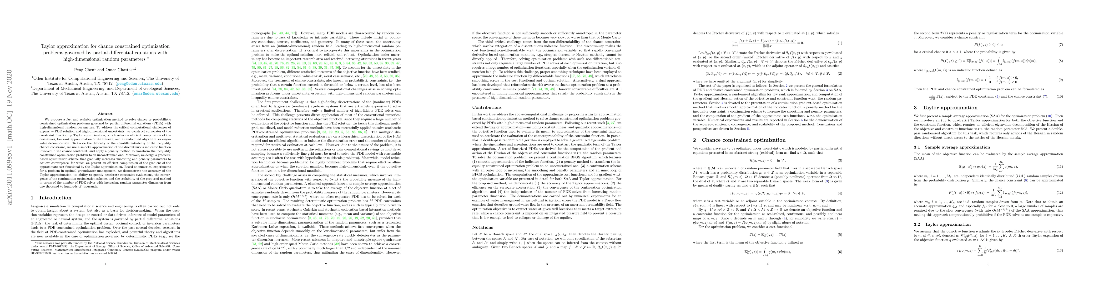 This paper proposes a scalable optimization method for solving chance constrained optimization problems governed by high-dimensional random parameters in PDEs. It employs Taylor approximation for surrogate construction, smooths non-differentiable constraints, and uses a gradient-based scheme with efficient computation to achieve convergence, demonstrating significant acceleration and scalability through numerical experiments in groundwater management.