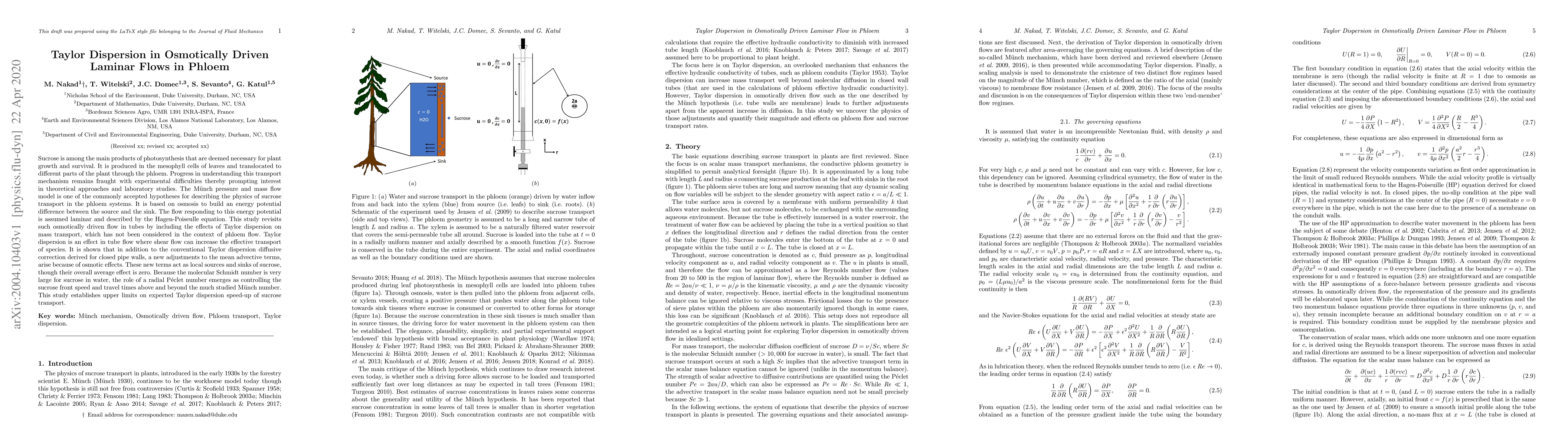 This study examines osmotically driven laminar flow in phloem, incorporating Taylor dispersion effects to enhance understanding of sucrose transport. It reveals new adjustments to mean advective terms due to osmotic effects, with the radial Peclet number playing a crucial role in controlling sucrose transport speed, establishing upper limits on the speed-up of sucrose transport.