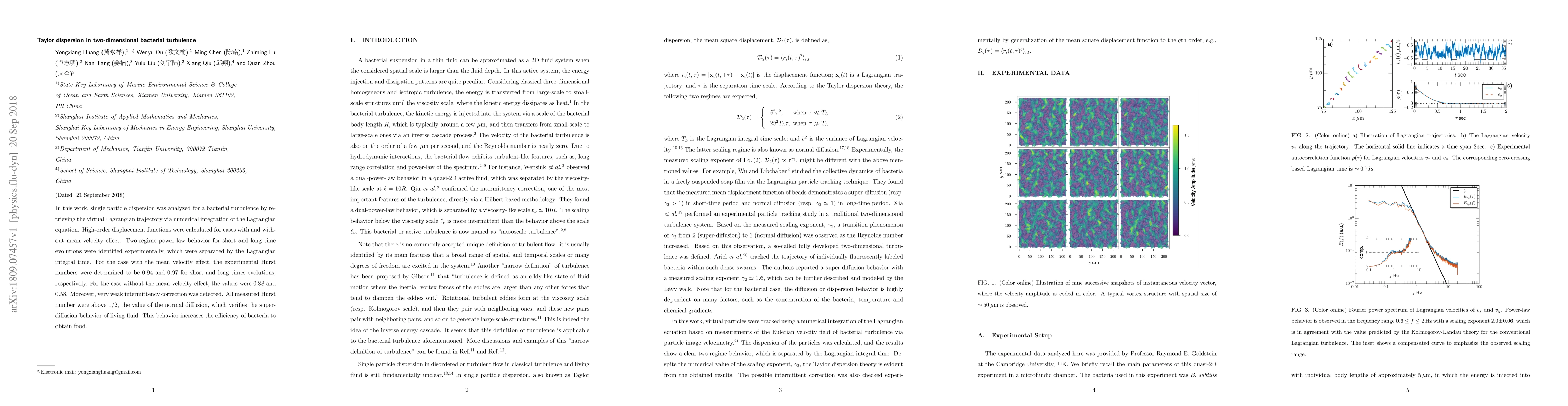 In this work, single particle dispersion was analyzed for a bacterial turbulence by retrieving the virtual Lagrangian trajectory via numerical integration of the Lagrangian equation. High-order displacement functions were calculated for cases with and without mean velocity effect. Two-regime power-law behavior for short and long time evolutions were identified experimentally, which were separated by the Lagrangian integral time. For the case with the mean velocity effect, the experimental Hurst numbers were determined to be $0.94$ and $0.97$ for short and long times evolutions, respectively. For the case without the mean velocity effect, the values were $0.88$ and $0.58$. Moreover, very weak intermittency correction was detected. All measured Hurst number were above $1/2$, the value of the normal diffusion, which verifies the super-diffusion behavior of living fluid. This behavior increases the efficiency of bacteria to obtain food.
