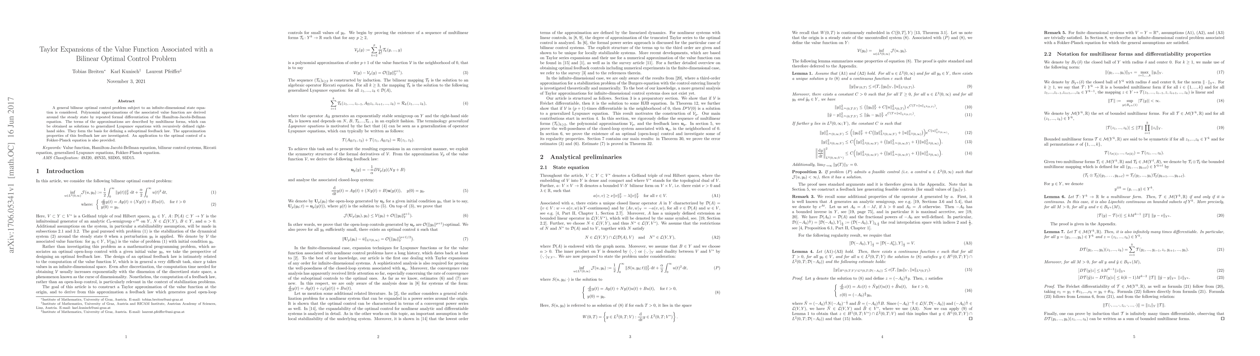 A general bilinear optimal control problem subject to an infinite-dimensional state equation is considered. Polynomial approximations of the associated value function are derived around the steady state by repeated formal differentiation of the Hamilton-Jacobi-Bellman equation. The terms of the approximations are described by multilinear forms, which can be obtained as solutions to generalized Lyapunov equations with recursively defined right-hand sides. They form the basis for defining a suboptimal feedback law. The approximation properties of this feedback law are investigated. An application to the optimal control of a Fokker-Planck equation is also provided.