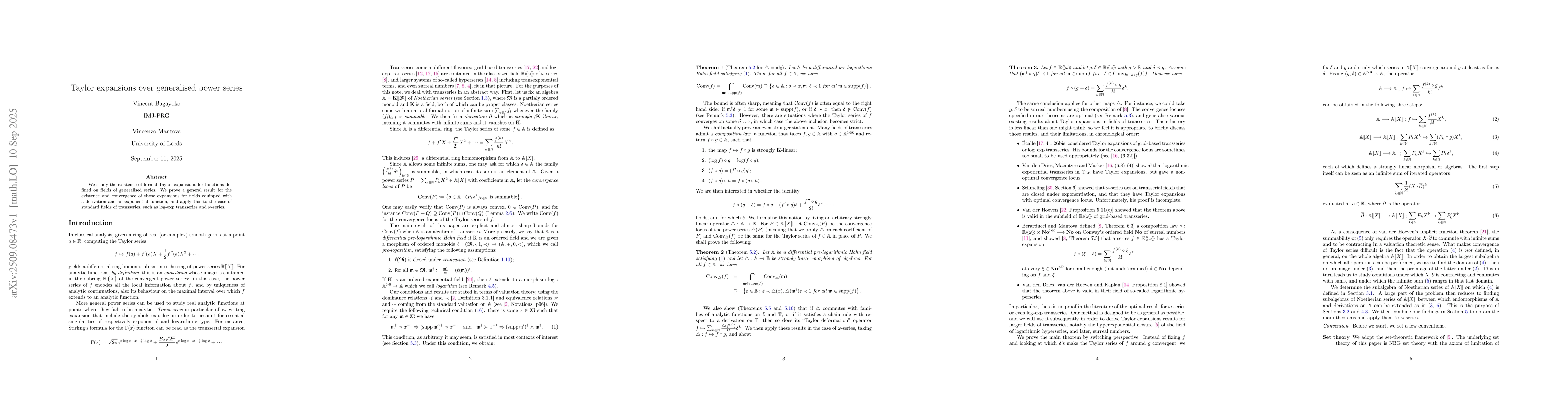 We study the existence of formal Taylor expansions for functions defined on fields of generalised series. We prove a general result for the existence and convergence of those expansions for fields equipped with a derivation and an exponential function, and apply this to the case of standard fields of transseries, such as $\log$-$\exp$ transseries and $\omega$-series.