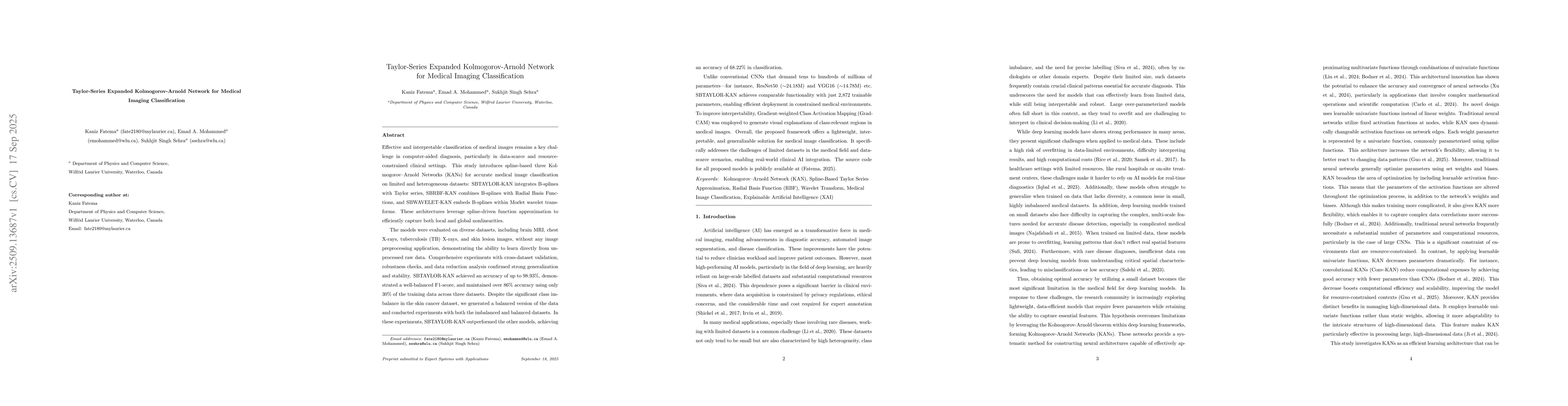 The study employed a spline-based KAN architecture leveraging Kolmogorov's superposition theorem, with three variants (SBTAYLOR-KAN, SBRBF-KAN, SBWAVELET-KAN) evaluated across four medical imaging datasets using Grad-CAM for interpretability validation.