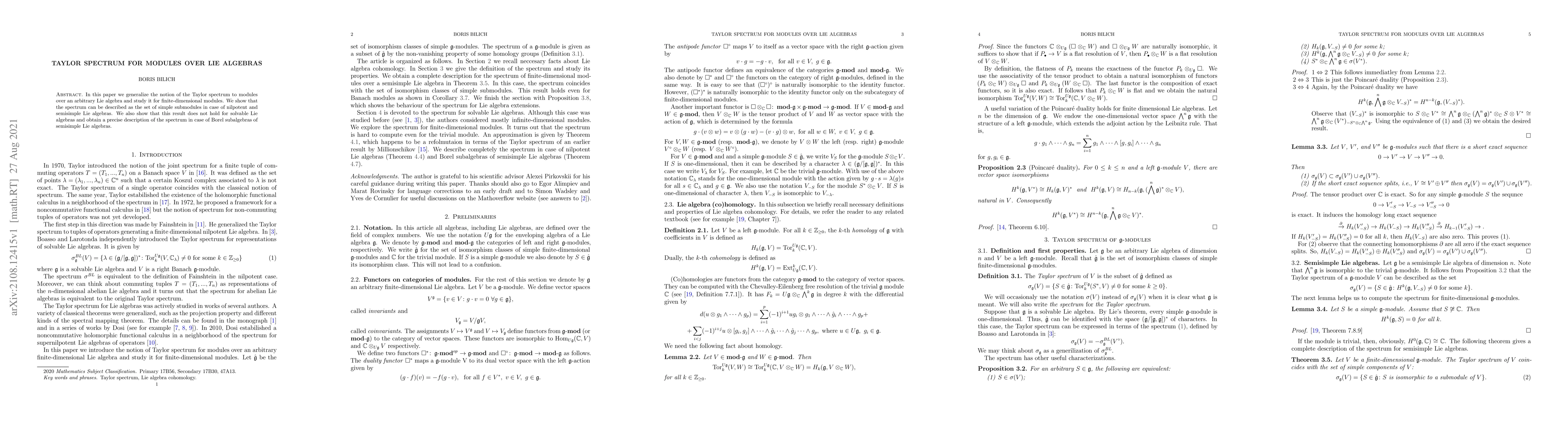 This paper generalizes the Taylor spectrum to finite-dimensional modules over arbitrary Lie algebras, demonstrating that it corresponds to simple submodules for nilpotent and semisimple Lie algebras, while providing a detailed description for solvable Lie algebras and Borel subalgebras of semisimple Lie algebras.