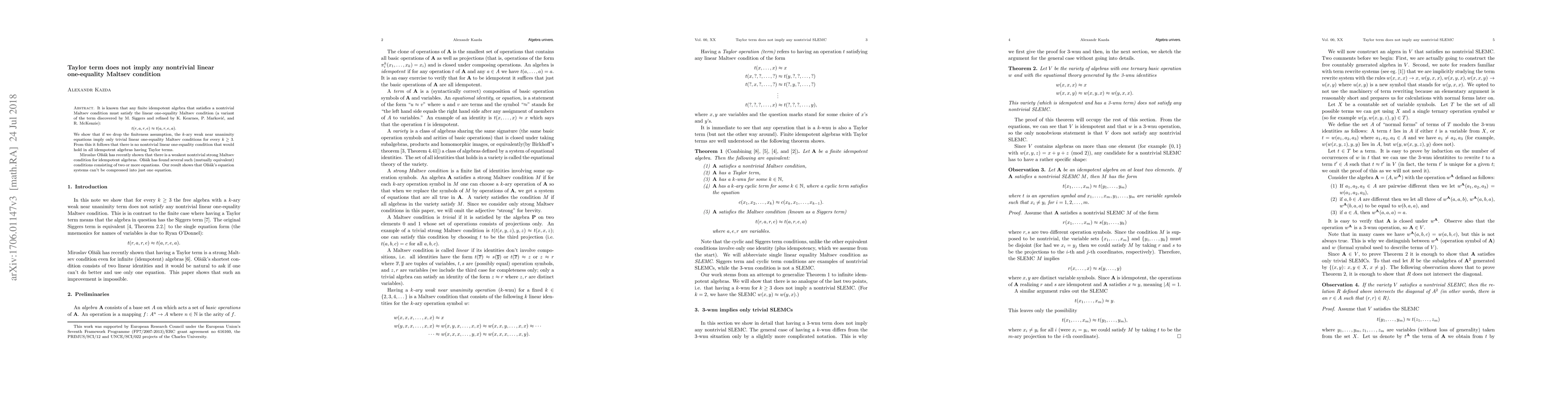 It is known that any finite idempotent algebra that satisfies a nontrivial Maltsev condition must satisfy the linear one-equality Maltsev condition (a variant of the term discovered by M. Siggers and refined by K. Kearnes, P. Markovi\'c, and R. McKenzie): \[ t(r,a,r,e)\approx t(a,r,e,a). \] We show that if we drop the finiteness assumption, the $k$-ary weak near unanimity equations imply only trivial linear one-equality Maltsev conditions for every $k\geq 3$. From this it follows that there is no nontrivial linear one-equality condition that would hold in all idempotent algebras having Taylor terms. Miroslav Ol\v{s}\'ak has recently shown that there is a weakest nontrivial strong Maltsev condition for idempotent algebras. Ol\v{s}\'ak has found several such (mutually equivalent) conditions consisting of two or more equations. Our result shows that Ol\v{s}\'ak's equation systems can't be compressed into just one equation.
