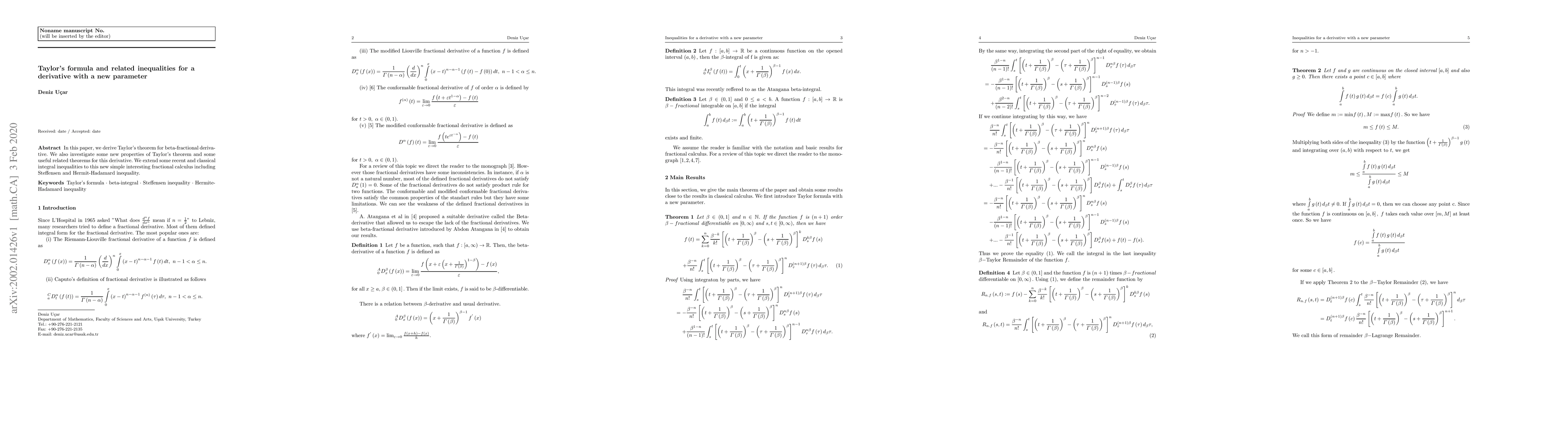 This paper derives Taylor's theorem for beta-fractional derivatives and explores new properties and related theorems. It also extends classical integral inequalities, including Steffensen and Hermit-Hadamard inequalities, to this novel fractional calculus framework.