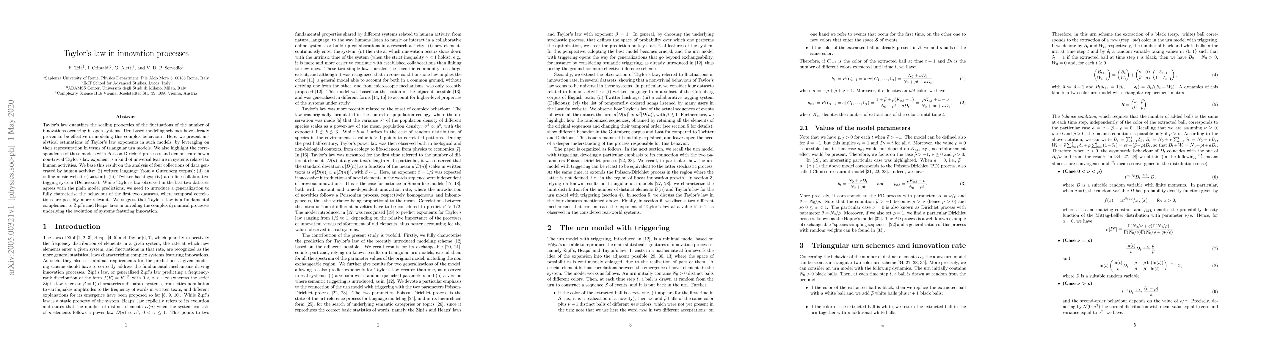 Taylor's law quantifies the scaling properties of the fluctuations of the number of innovations occurring in open systems. Urn based modelling schemes have already proven to be effective in modelling this complex behaviour. Here, we present analytical estimations of Taylor's law exponents in such models, by leveraging on their representation in terms of triangular urn models. We also highlight the correspondence of these models with Poisson-Dirichlet processes and demonstrate how a non-trivial Taylor's law exponent is a kind of universal feature in systems related to human activities. We base this result on the analysis of four collections of data generated by human activity: (i) written language (from a Gutenberg corpus); (ii) a n online music website (Last.fm); (iii) Twitter hashtags; (iv) a on-line collaborative tagging system (Del.icio.us). While Taylor's law observed in the last two datasets agrees with the plain model predictions, we need to introduce a generalization to fully characterize the behaviour of the first two datasets, where temporal correlations are possibly more relevant. We suggest that Taylor's law is a fundamental complement to Zipf's and Heaps' laws in unveiling the complex dynamical processes underlying the evolution of systems featuring innovation.