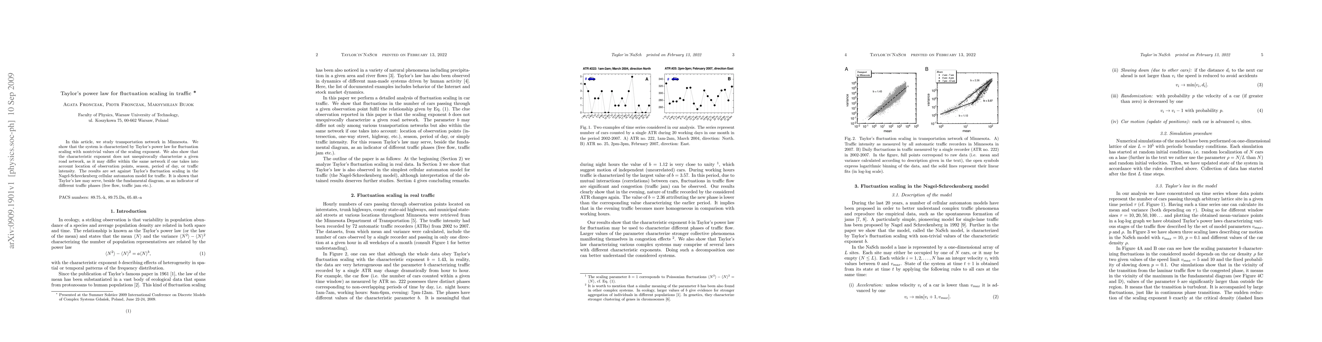 In this article, we study transportation network in Minnesota. We show that the system is characterized by Taylor's power law for fluctuation scaling with nontrivial values of the scaling exponent. We also show that the characteristic exponent does not unequivocally characterize a given road network, as it may differ within the same network if one takes into account location of observation points, season, period of day, or traffic intensity. The results are set against Taylor's fluctuation scaling in the Nagel-Schreckenberg cellular automaton model for traffic. It is shown that Taylor's law may serve, beside the fundamental diagram, as an indicator of different traffic phases (free flow, traffic jam etc.).