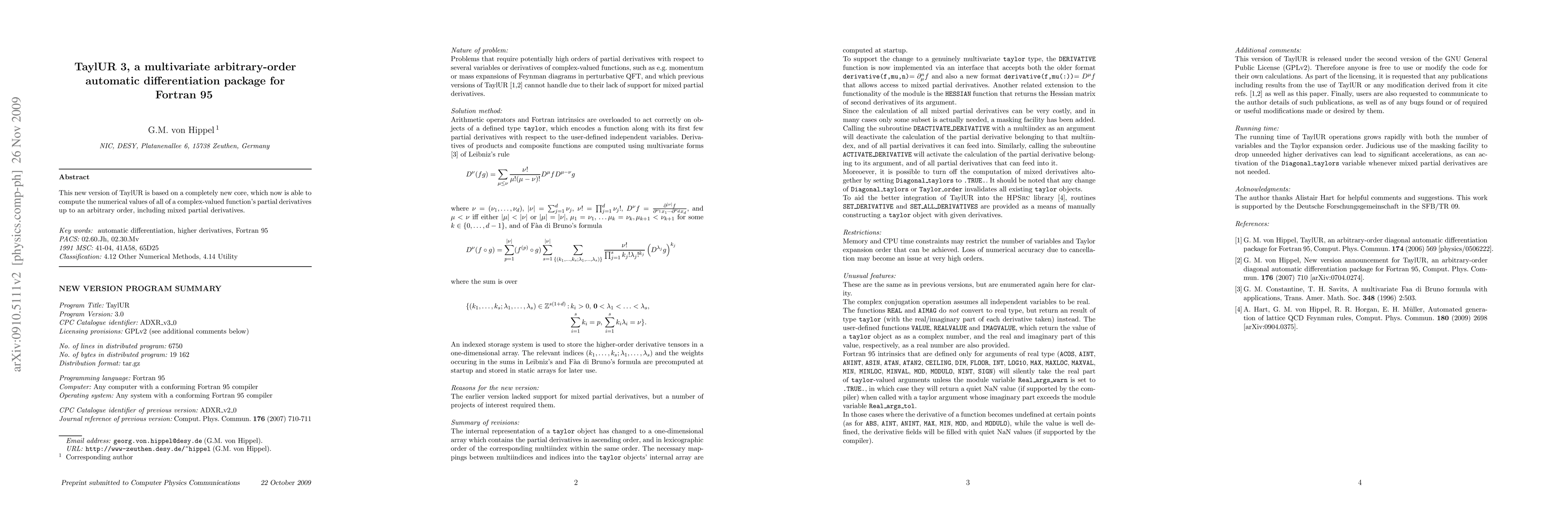 TaylUR 3 is a Fortran 95 package for automatic differentiation of complex-valued functions, capable of computing all partial derivatives up to an arbitrary order, including mixed partial derivatives. It overloads arithmetic operators and Fortran intrinsics to act correctly on objects of a defined type 'taylor', which encodes a function along with its first few partial derivatives. Derivatives of products and composite functions are computed using multivariate forms of Leibniz's and Faa di Bruno's formulas. An indexed storage system is used to store higher-order derivative tensors in a one-dimensional array.