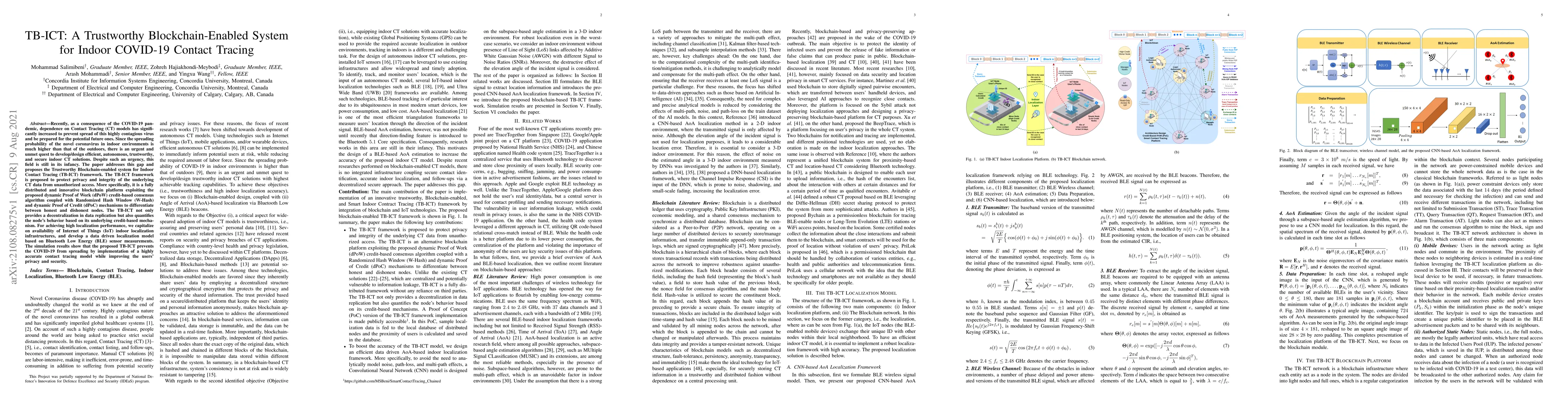 The paper proposes TB-ICT, a blockchain-enabled system for indoor COVID-19 contact tracing, utilizing a dynamic Proof of Work consensus algorithm and IoT infrastructure for high accuracy. The system ensures privacy and security through decentralized data replication and a credit-based mechanism to differentiate between honest and dishonest nodes.