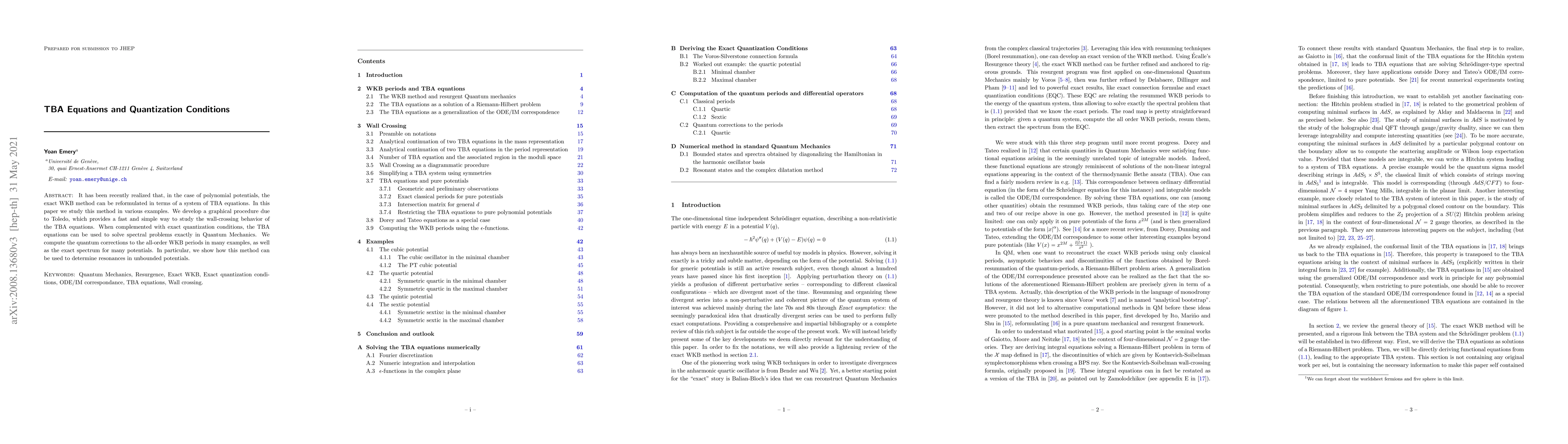 It has been recently realized that, in the case of polynomial potentials, the exact WKB method can be reformulated in terms of a system of TBA equations. In this paper we study this method in various examples. We develop a graphical procedure due to Toledo, which provides a fast and simple way to study the wall-crossing behavior of the TBA equations. When complemented with exact quantization conditions, the TBA equations can be used to solve spectral problems exactly in Quantum Mechanics. We compute the quantum corrections to the all-order WKB periods in many examples, as well as the exact spectrum for many potentials. In particular, we show how this method can be used to determine resonances in unbounded potentials.