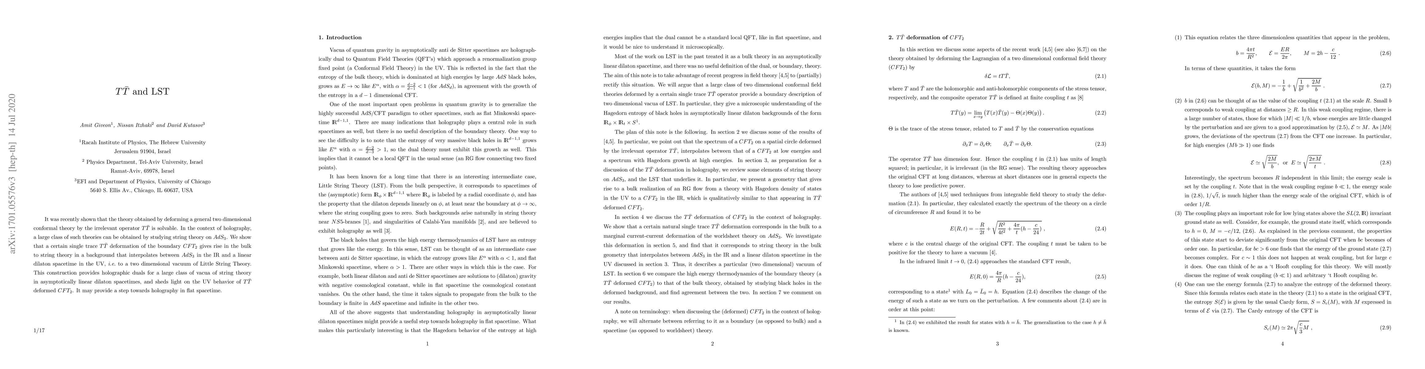 It was recently shown that the theory obtained by deforming a general two dimensional conformal theory by the irrelevant operator $T\bar T$ is solvable. In the context of holography, a large class of such theories can be obtained by studying string theory on $AdS_3$. We show that a certain $T\bar T$ deformation of the boundary $CFT_2$ gives rise in the bulk to string theory in a background that interpolates between $AdS_3$ in the IR and a linear dilaton spacetime in the UV, i.e. to a two dimensional vacuum of Little String Theory. This construction provides holographic duals for a large class of vacua of string theory in asymptotically linear dilaton spacetimes, and sheds light on the UV behavior of $T\bar T$ deformed $CFT_2$. It may provide a step towards holography in flat spacetime.