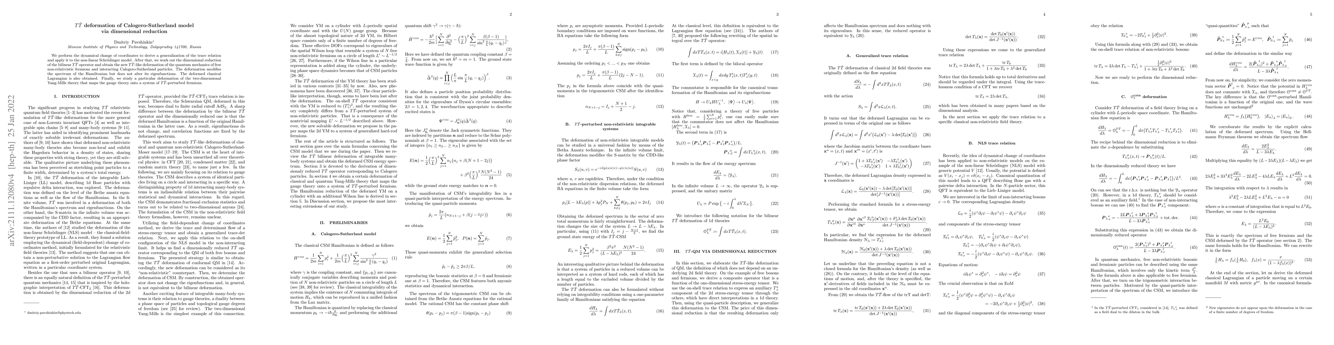 We perform the dynamical change of coordinates to derive a generalization of the trace relation and apply it to the non-linear Schr\"odinger model. After that, we work out the dimensional reduction of the bilinear $T\bar T$ operator and obtain the new $T\bar T$-like deformation of the quantum mechanics of free non-relativistic fermions and interacting Calogero-Sutherland particles. The deformation modifies the spectrum of the Hamiltonian but does not alter its eigenfunctions. The deformed classical Lagrangian is also obtained. Finally, we study a particular deformation of the two-dimensional Yang-Mills theory that maps the gauge theory onto a system of $T\bar T$-perturbed fermions.