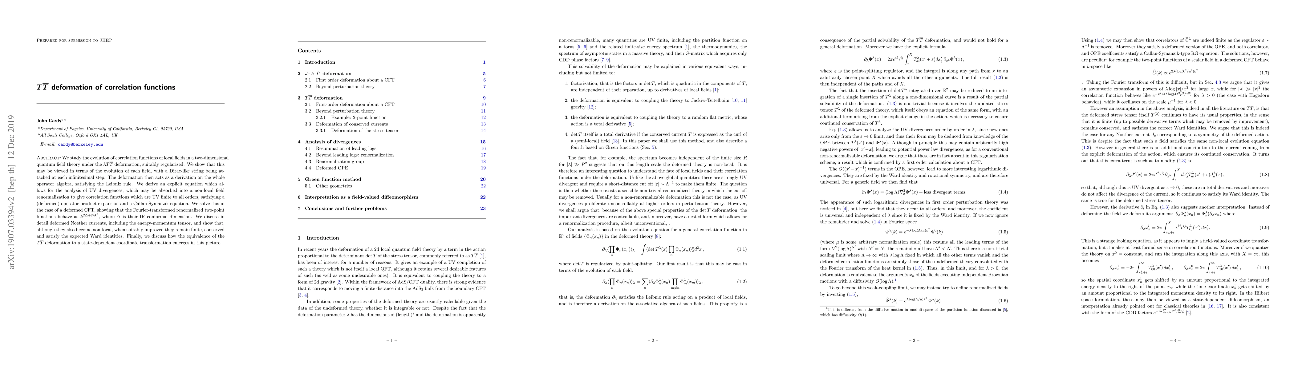 Researchers study how a deformation in 2D quantum field theory affects correlation functions, finding they can be analyzed using a Dirac-like string, resulting in UV finite correlation functions with conserved Noether currents.