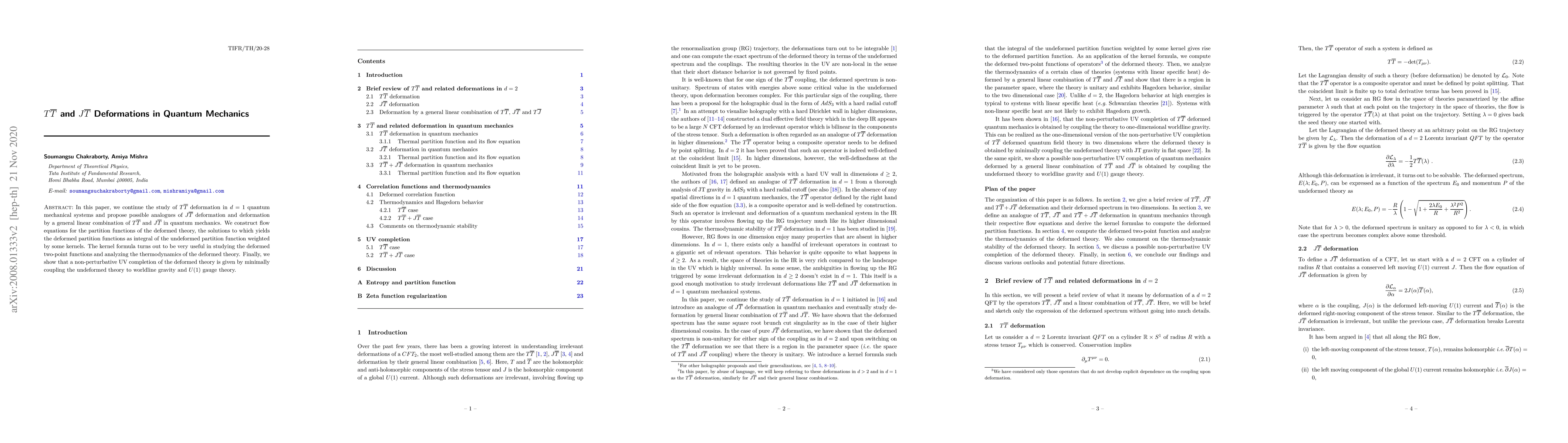 This paper studies $T\bar{T}$ deformation in 1D quantum mechanics and proposes analogues of $J\bar{T}$ deformation. It constructs flow equations for deformed partition functions, useful for analyzing deformed two-point functions and thermodynamics, and suggests a UV completion through coupling to worldline gravity and $U(1)$ gauge theory.