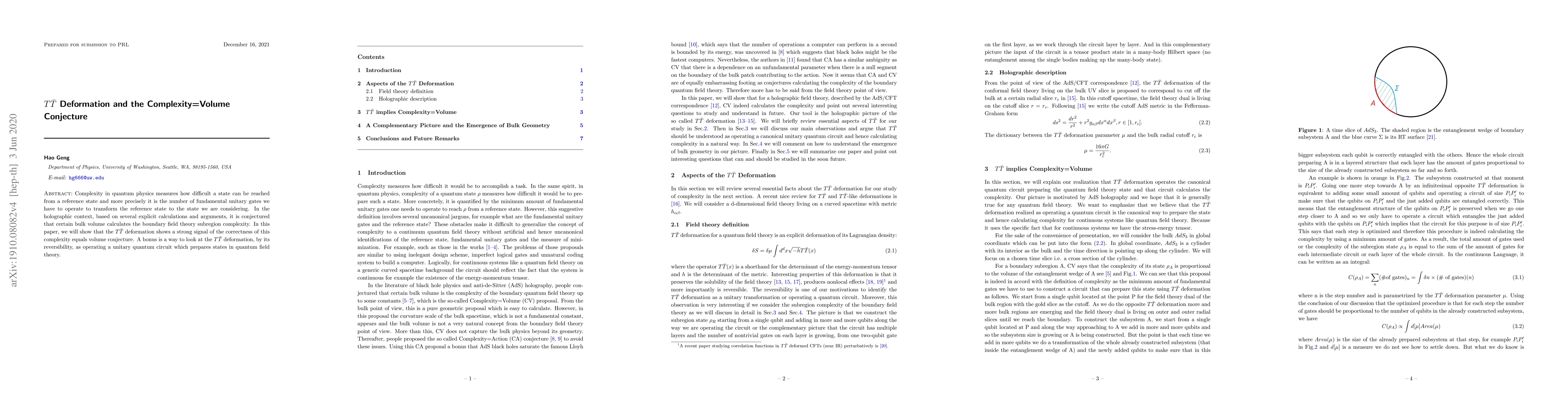 This paper investigates the $T\bar{T}$ deformation in quantum field theory and demonstrates its alignment with the Complexity=Volume Conjecture, suggesting that the bulk volume can determine boundary field theory subregion complexity. Additionally, it presents the $T\bar{T}$ deformation as a reversible unitary quantum circuit.