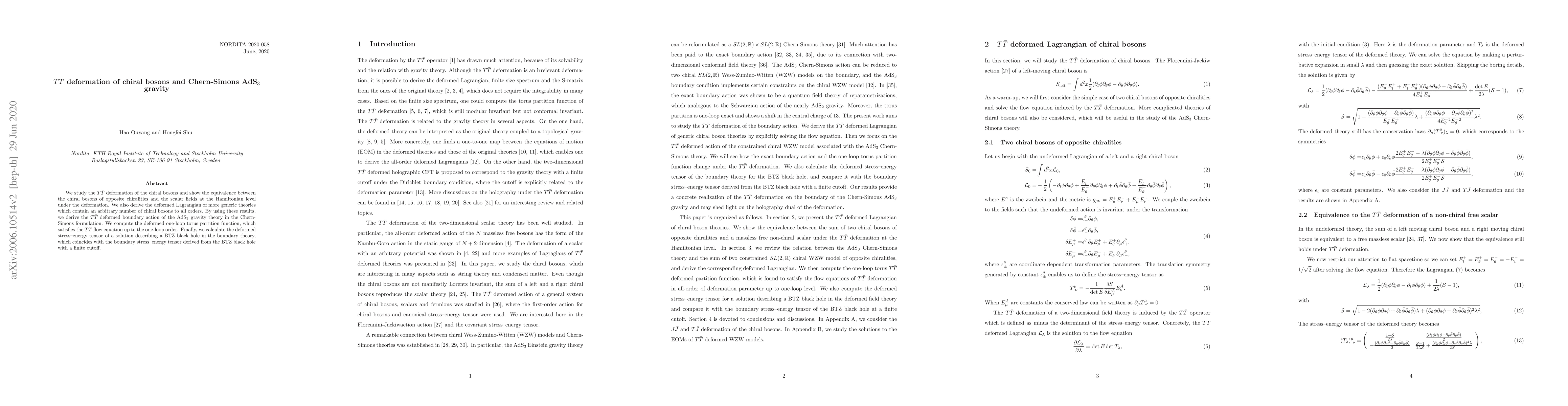 Researchers study the $Tar{T}$ deformation of chiral bosons in AdS$_3$ gravity theory, demonstrating equivalence between opposite chirality bosons and scalar fields at the Hamiltonian level, and calculating a deformed stress tensor for a BTZ black hole.