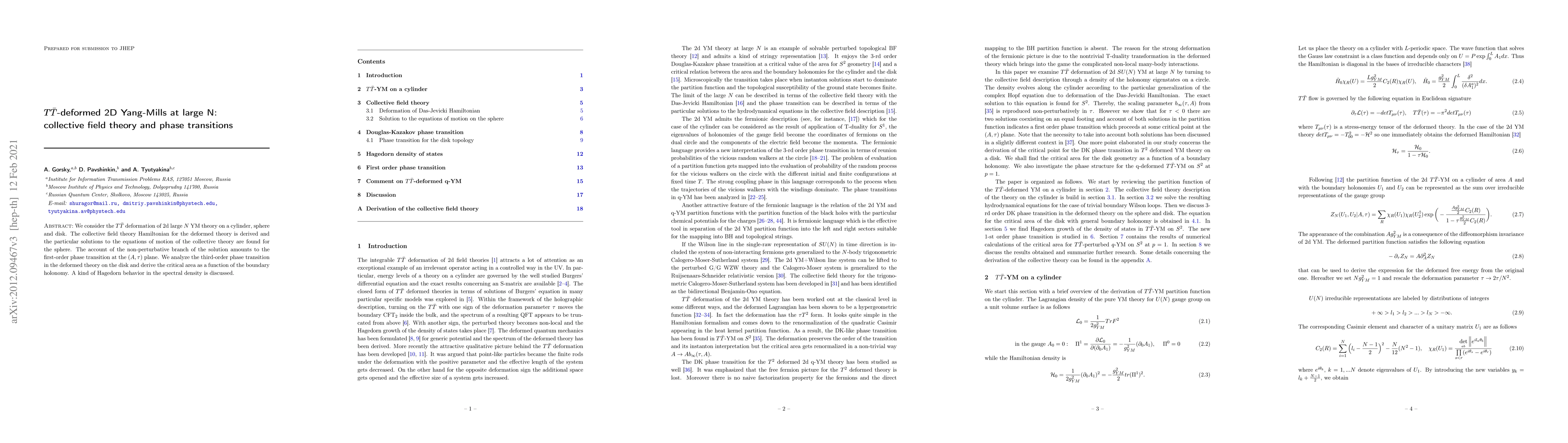 We consider the $T\bar T$ deformation of 2d large $N$ YM theory on a cylinder, sphere and disk. The collective field theory Hamiltonian for the deformed theory is derived and the particular solutions to the equations of motion of the collective theory are found for the sphere. The account of the non-perturbative branch of the solution amounts to the first-order phase transition at the $(A,\tau)$ plane. We analyze the third-order phase transition in the deformed theory on the disk and derive the critical area as a function of the boundary holonomy. A kind of Hagedorn behavior in the spectral density is discussed.