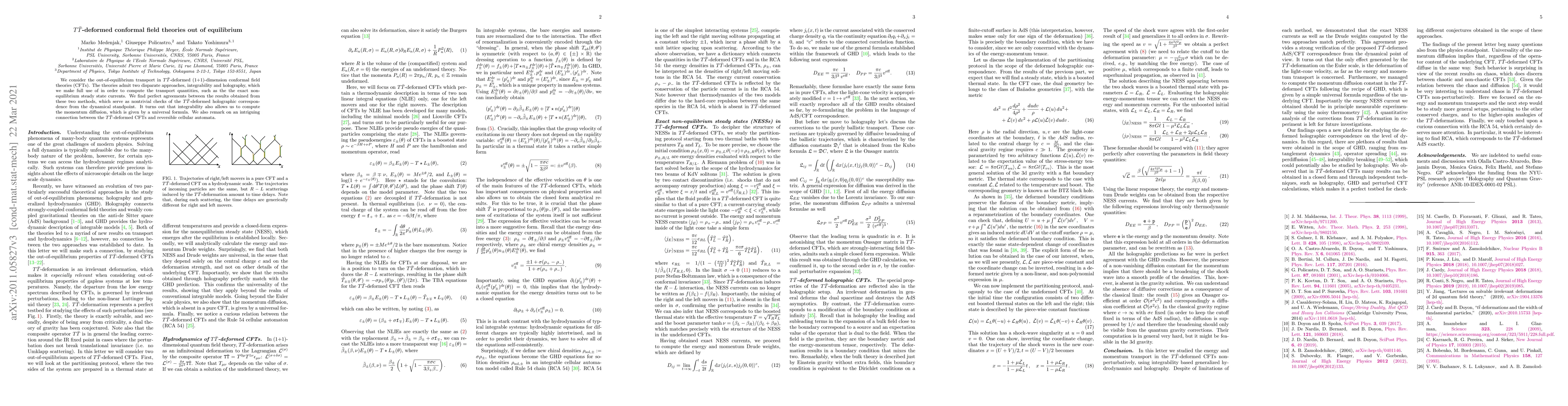 This paper investigates out-of-equilibrium transport in $T\bar{T}$-deformed (1+1)-dimensional conformal field theories, employing both integrability and holography to compute transport quantities. The study reveals perfect agreement between results from these methods and highlights a universal formula for momentum diffusion derived from integrability.