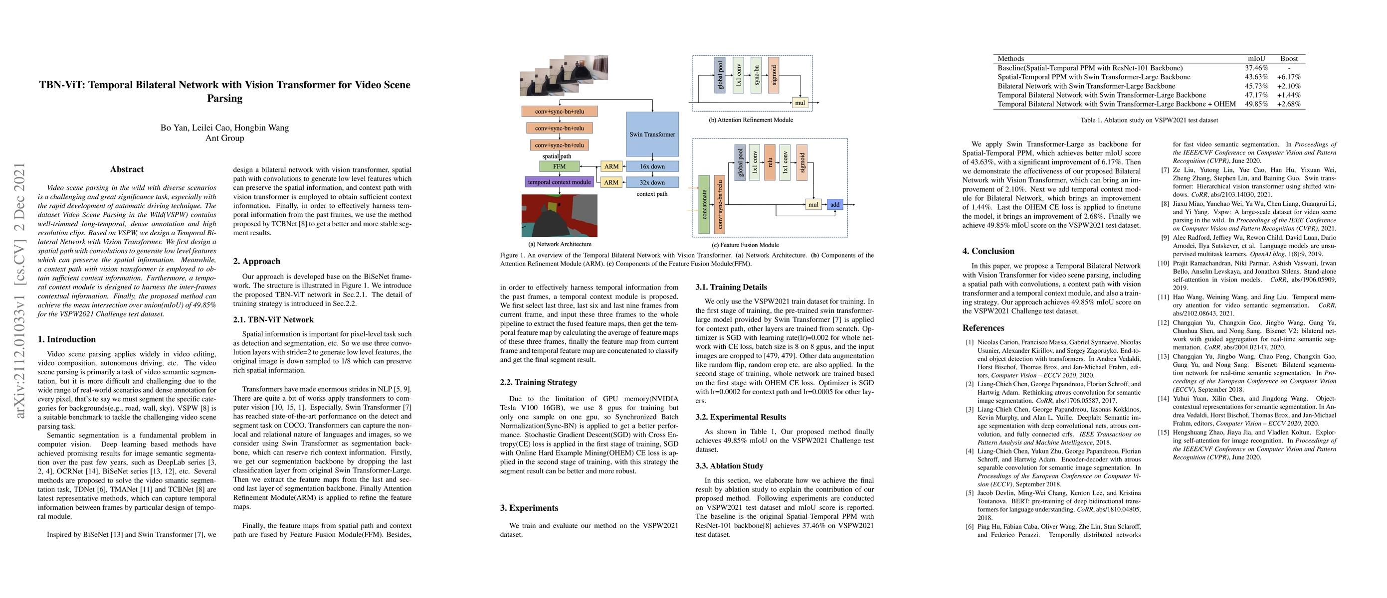 The paper introduces TBN-ViT, a Temporal Bilateral Network with Vision Transformer for video scene parsing, combining spatial convolutions and Vision Transformer for context to achieve a mean intersection over union (mIoU) of 49.85% on the VSPW2021 Challenge test dataset.