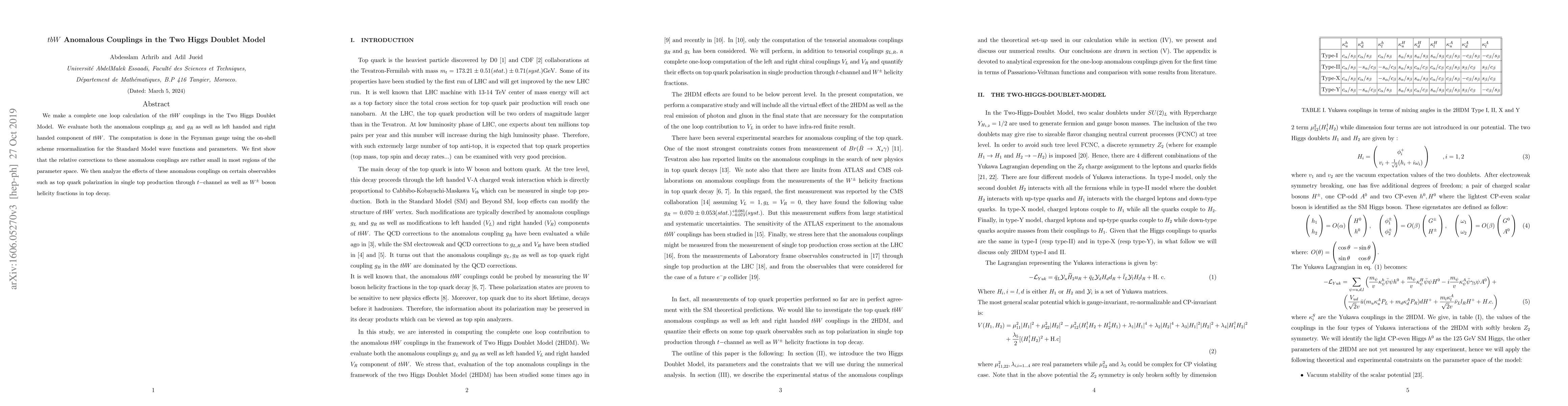 We make a complete one loop calculation of the $tbW$ couplings in the Two Higgs Doublet Model. We evaluate both the anomalous couplings $g_L$ and $g_R$ as well as left handed and right handed component of $tbW$. The computation is done in the Feynman gauge using the on-shell scheme renormalization for the Standard Model wave functions and parameters. We first show that the relative corrections to these anomalous couplings are rather small in most regions of the parameter space. We then analyze the effects of these anomalous couplings on certain observables such as top quark polarization in single top production through $t-$channel as well as $W^\pm$ boson helicity fractions in top decay.