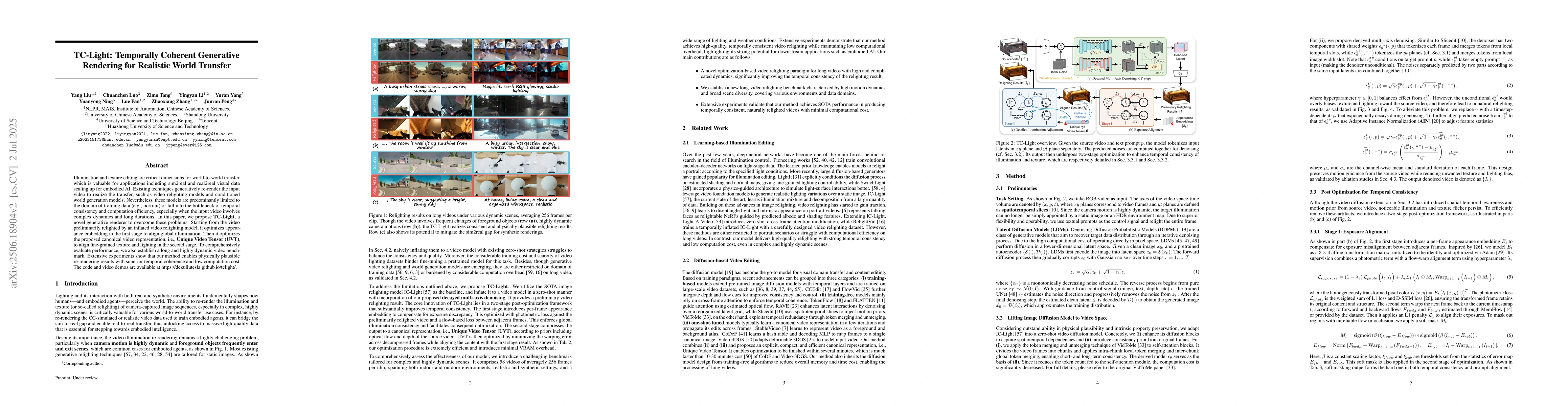 Editing illumination in long videos with complex dynamics has significant value in various downstream tasks, including visual content creation and manipulation, as well as data scaling up for embodied AI through sim2real and real2real transfer. Nevertheless, existing video relighting techniques are predominantly limited to portrait videos or fall into the bottleneck of temporal consistency and computation efficiency. In this paper, we propose TC-Light, a novel paradigm characterized by the proposed two-stage post optimization mechanism. Starting from the video preliminarily relighted by an inflated video relighting model, it optimizes appearance embedding in the first stage to align global illumination. Then it optimizes the proposed canonical video representation, i.e., Unique Video Tensor (UVT), to align fine-grained texture and lighting in the second stage. To comprehensively evaluate performance, we also establish a long and highly dynamic video benchmark. Extensive experiments show that our method enables physically plausible relighting results with superior temporal coherence and low computation cost. The code and video demos are available at https://dekuliutesla.github.io/tclight/.