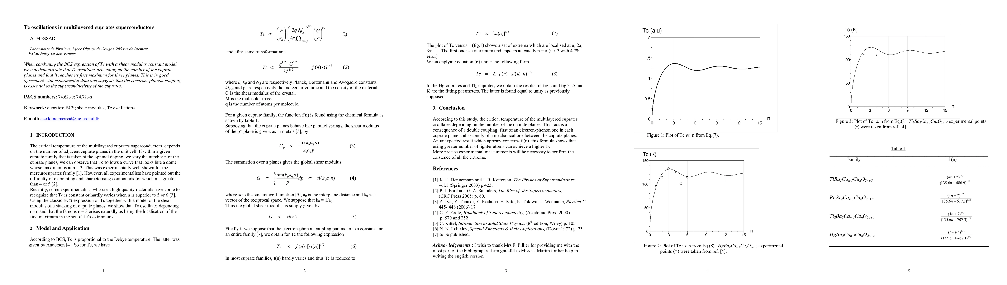 Summary: This study combines BCS theory with a shear modulus model to show that the critical temperature (Tc) of multilayered cuprate superconductors oscillates with the number of cuprate planes, peaking at three planes, which aligns well with experimental observations and highlights the importance of electron-phonon coupling in superconductivity.