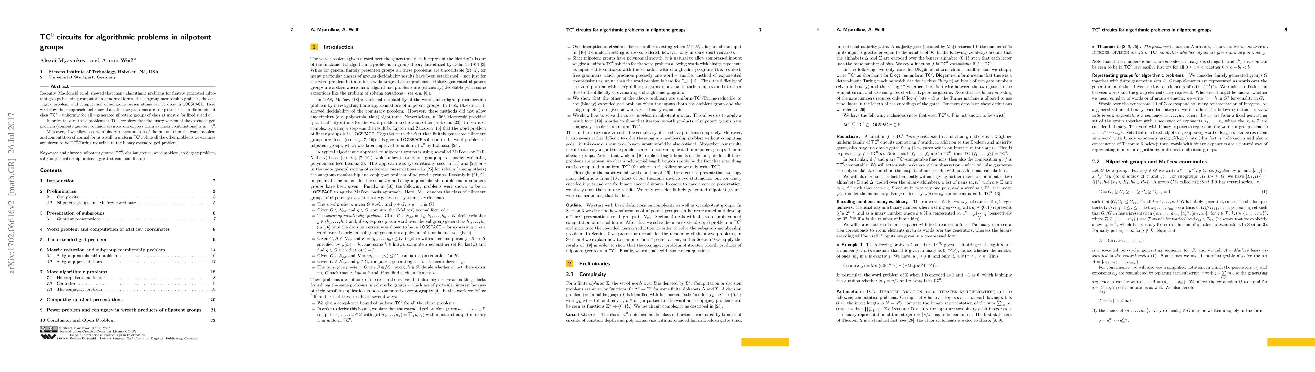 Summary: The paper demonstrates that several algorithmic problems for finitely generated nilpotent groups can be solved using TC^0 circuits. It shows the completeness of these problems for uniform TC^0 circuits when the groups are r-generated and of class at most c, and proves the unary extended gcd problem is within TC^0.