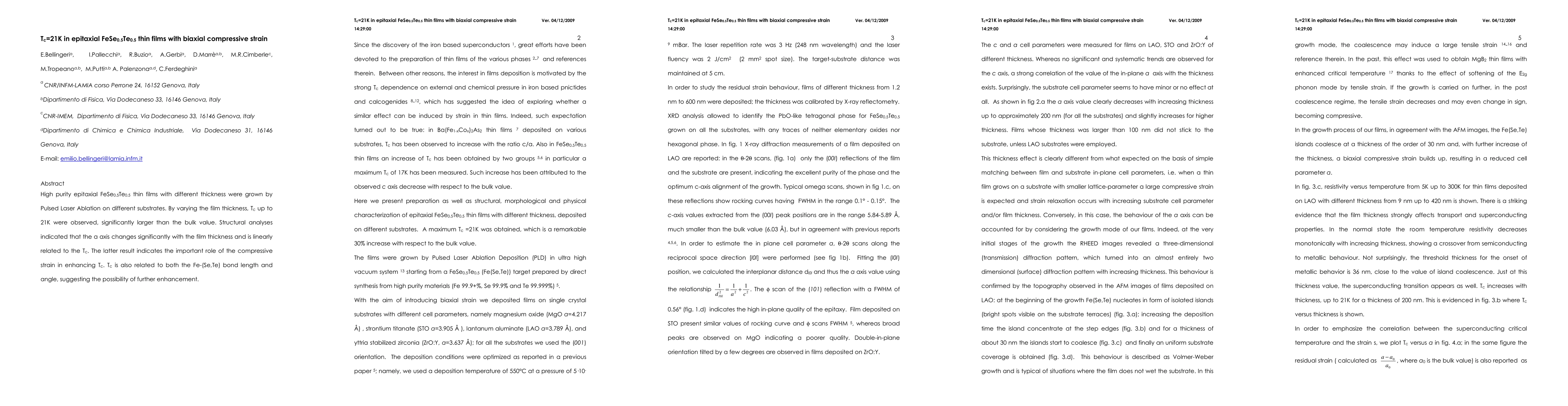 High purity epitaxial FeSe0.5Te0.5 thin films with different thickness were grown by Pulsed Laser Ablation on different substrates. By varying the film thickness, Tc up to 21K were observed, significantly larger than the bulk value. Structural analyses indicated that the a axis changes significantly with the film thickness and is linearly related to the Tc. The latter result indicates the important role of the compressive strain in enhancing Tc. Tc is also related to both the Fe-(Se,Te) bond length and angle, suggesting the possibility of further enhancement.