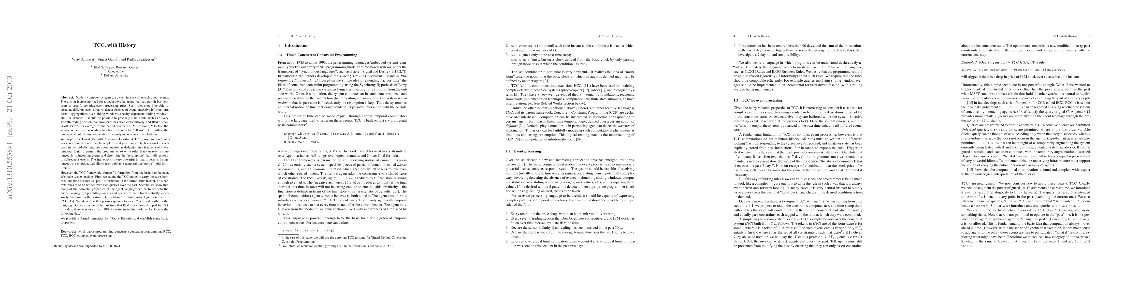 Modern computer systems are awash in a sea of asynchronous events. There is an increasing need for a declarative language that can permit business users to specify complex event-processing rules. Such rules should be able to correlate different event streams, detect absence of events (negative information), permit aggregations over sliding windows, specify dependent sliding windows etc. For instance it should be possible to precisely state a rule such as "Every seventh trading session that DowJones has risen consecutively, and IBM's stock is off 3% over its average in this period, evaluate IBM position", "Declare the sensor as faulty if no reading has been received for 500 ms", etc. Further, the language should be implementable efficiently in an event-driven fashion. We propose the Timed (Default) Concurrent Constraint, TCC, programming framework as a foundation for such complex event processing. While very rich, the TCC framework "forgets" information from one instant to the next. We make two extensions. First, we extend the TCC model to carry the store from previous time instants as "past" information in the current time instant. This permits rules to to be written with rich queries over the past. Second, we show that many of the powerful properties of the agent language can be folded into the query language by permitting agents and queries to be defined mutually recursively, building on the testing interpretation of intuitionistic logic described in RCC \cite{radha-fsttcs05}. We show that this permits queries to move "back and forth" in the past, e.g.{} "Order a review if the last time that IBM stock price dropped by 10% in a day, there was more than 20% increase in trading volume for Oracle the following day." We provide a formal semantics for TCC + Histories and establish some basic properties.