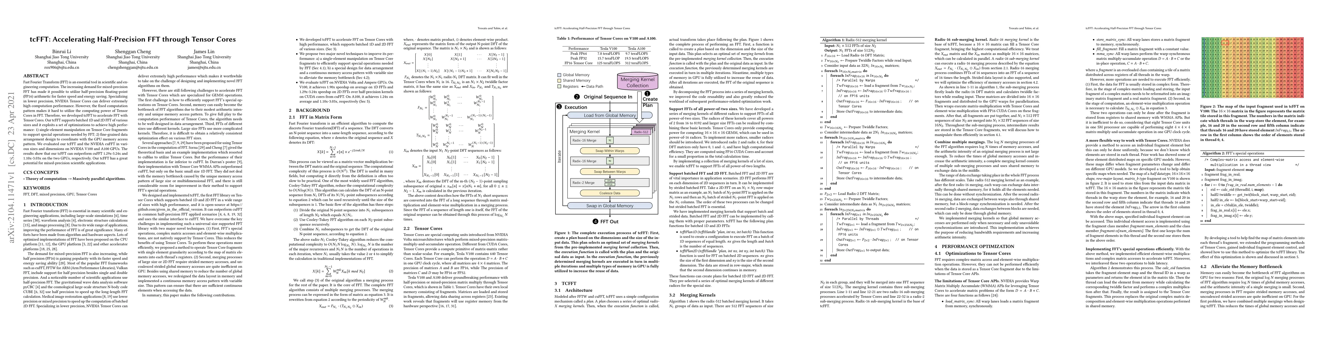 The paper introduces tcFFT, a method to accelerate half-precision FFT using Tensor Cores for improved performance and energy efficiency. The proposed approach achieves significant speedups over cuFFT, demonstrating up to 3.24x and 3.03x improvements on different GPUs, highlighting its potential for mixed-precision applications.