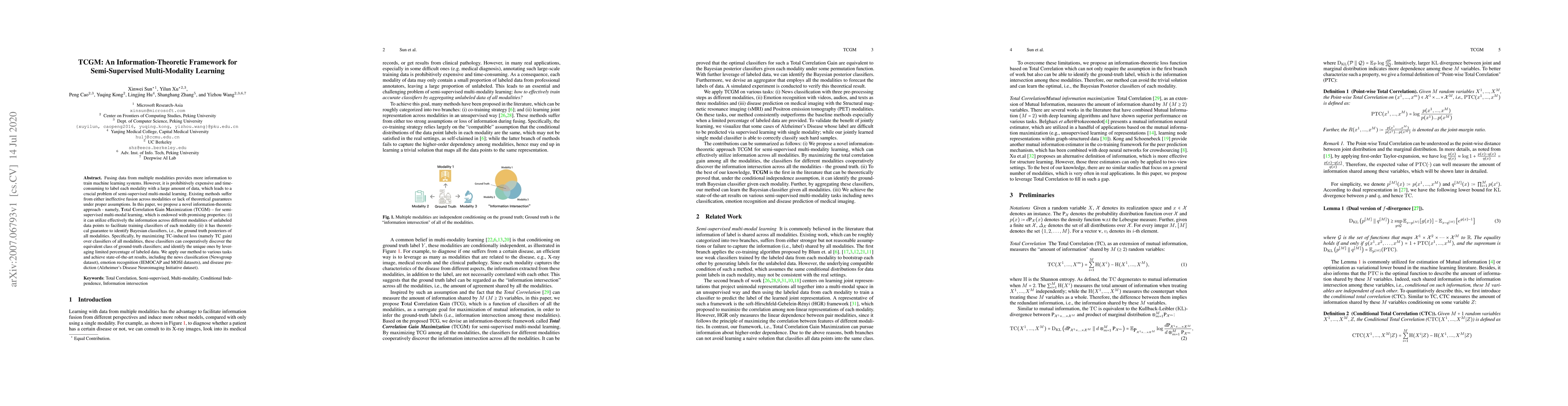 The paper introduces TCGM, an information-theoretic framework for semi-supervised multi-modal learning that effectively utilizes unlabeled data across modalities to train classifiers, while providing theoretical guarantees for identifying Bayesian classifiers. The TCGM approach achieves state-of-the-art results in tasks like news classification, emotion recognition, and disease prediction.
