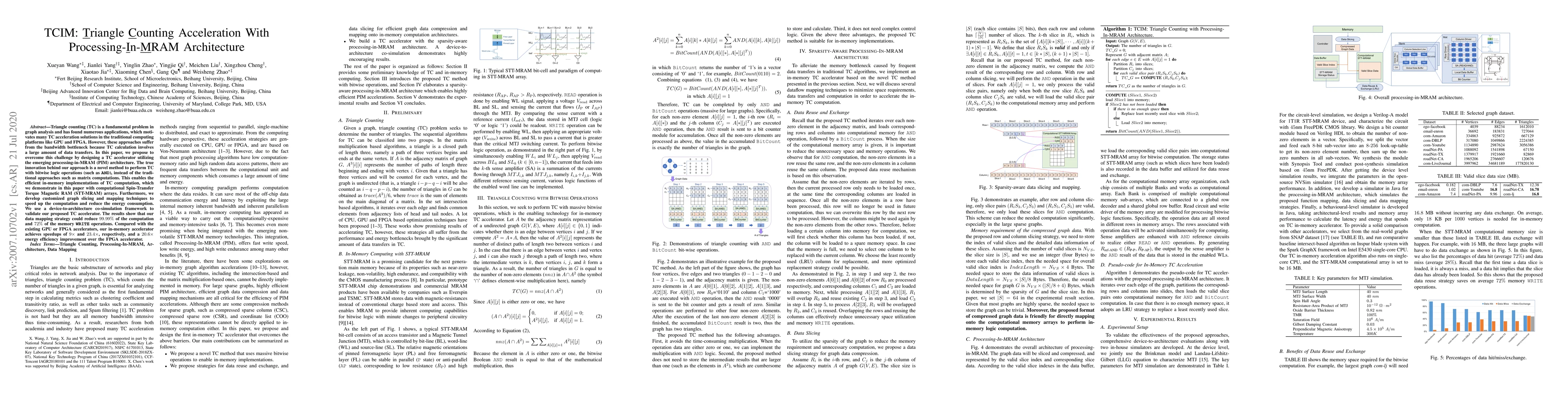 This paper proposes a novel TC accelerator using a PIM architecture with STT-MRAM to overcome the bandwidth bottleneck of traditional TC solutions. It employs bitwise logic operations for efficient in-memory computation, achieving significant speedups and energy efficiency improvements over GPU and FPGA-based approaches.
