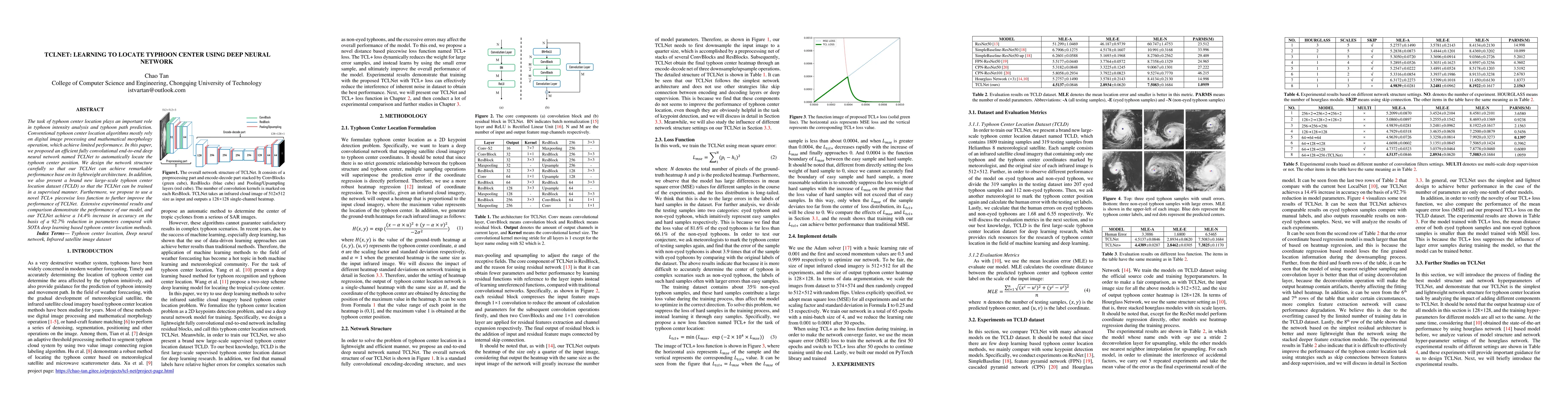 This paper introduces TCLNet, a lightweight fully convolutional deep neural network designed for accurate typhoon center location, achieving a 14.4% accuracy increase with a 92.7% reduction in parameters compared to state-of-the-art methods. The study also presents a new large-scale dataset and a novel TCL+ piecewise loss function to enhance model performance.