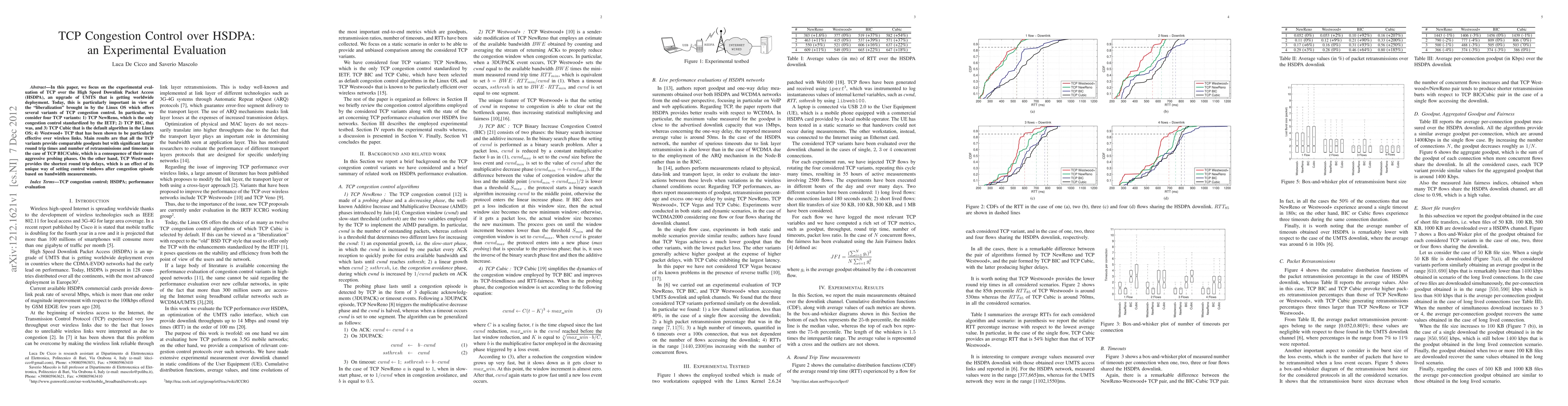 This paper evaluates four TCP variants over HSDPA, finding comparable goodputs but noting that TCP BIC/Cubic have higher round trip times and retransmissions due to aggressive probing, while TCP Westwood+ offers the shortest delays through bandwidth-based control window adjustments.