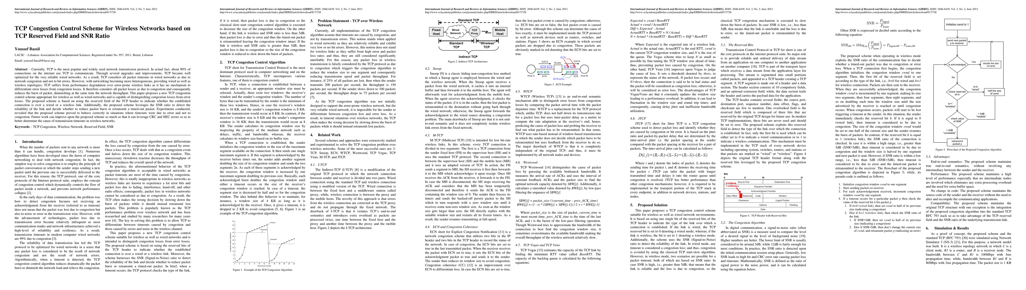 This paper proposes a new TCP congestion control scheme for wireless networks that uses the TCP reserved field and SNR ratio to distinguish between congestion and error losses. The scheme aims to improve TCP performance over wireless links by appropriately adjusting packet bursts and retransmissions based on link reliability.