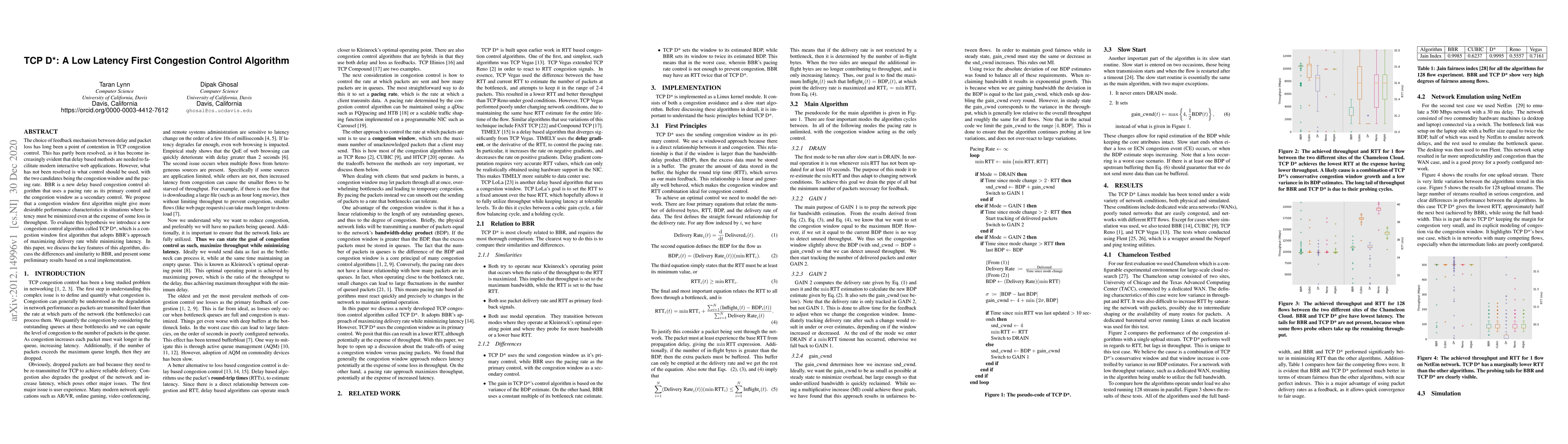The paper proposes TCP D*, a low latency congestion control algorithm prioritizing congestion window over pacing rate to minimize latency while maximizing delivery rate, contrasting with BBR's pacing rate approach. Preliminary results from a real implementation are presented to evaluate its performance.
