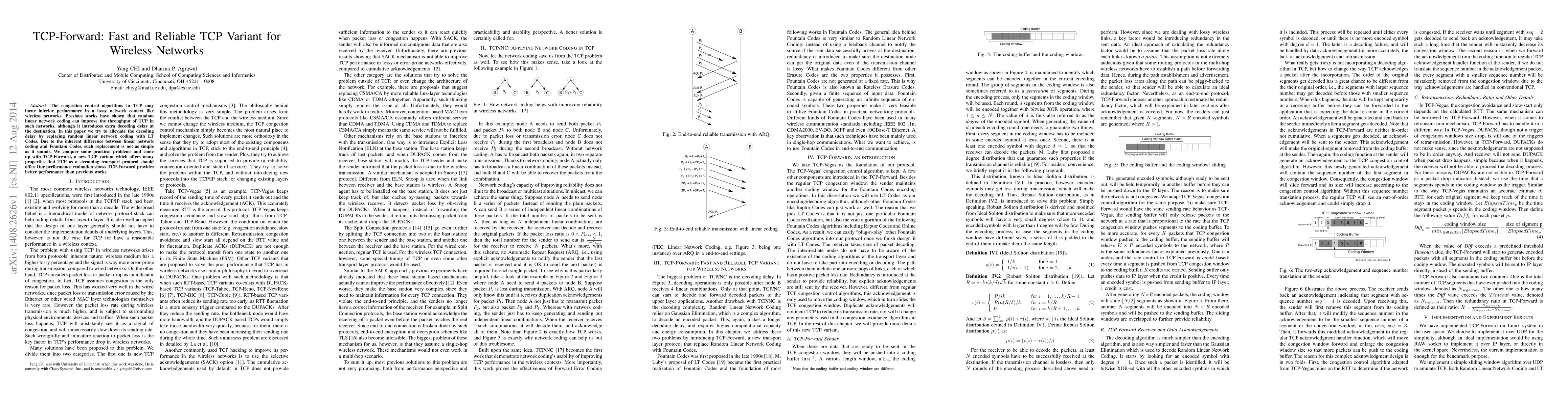 TCP-Forward is a new TCP variant designed to improve performance in lossy wireless networks by replacing random linear network coding with LT Codes to reduce decoding delay. It maintains essential TCP properties and outperforms previous methods in throughput.