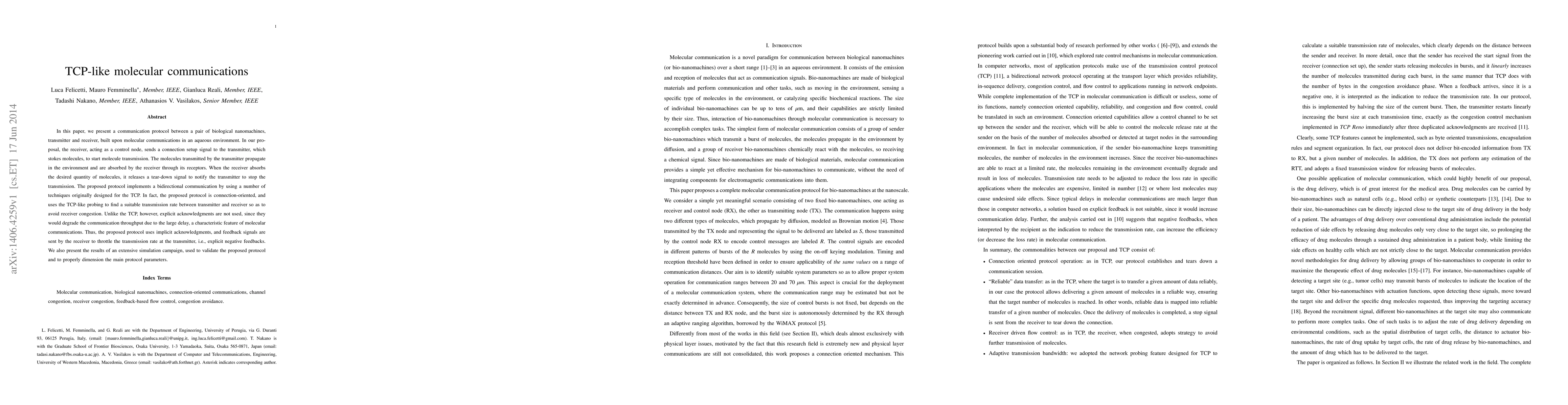 In this paper, we present a communication protocol between a pair of biological nanomachines, transmitter and receiver, built upon molecular communications in an aqueous environment. In our proposal, the receiver, acting as a control node, sends a connection setup signal to the transmitter, which stokes molecules, to start molecule transmission. The molecules transmitted by the transmitter propagate in the environment and are absorbed by the receiver through its receptors. When the receiver absorbs the desired quantity of molecules, it releases a tear-down signal to notify the transmitter to stop the transmission. The proposed protocol implements a bidirectional communication by using a number of techniques originally designed for the TCP. In fact, the proposed protocol is connection-oriented, and uses the TCP-like probing to find a suitable transmission rate between transmitter and receiver so as to avoid receiver congestion. Unlike the TCP, however, explicit acknowledgments are not used, since they would degrade the communication throughput due to the large delay, a characteristic feature of molecular communications. Thus, the proposed protocol uses implicit acknowledgments, and feedback signals are sent by the receiver to throttle the transmission rate at the transmitter, i.e., explicit negative feedbacks. We also present the results of an extensive simulation campaign, used to validate the proposed protocol and to properly dimension the main protocol parameters.