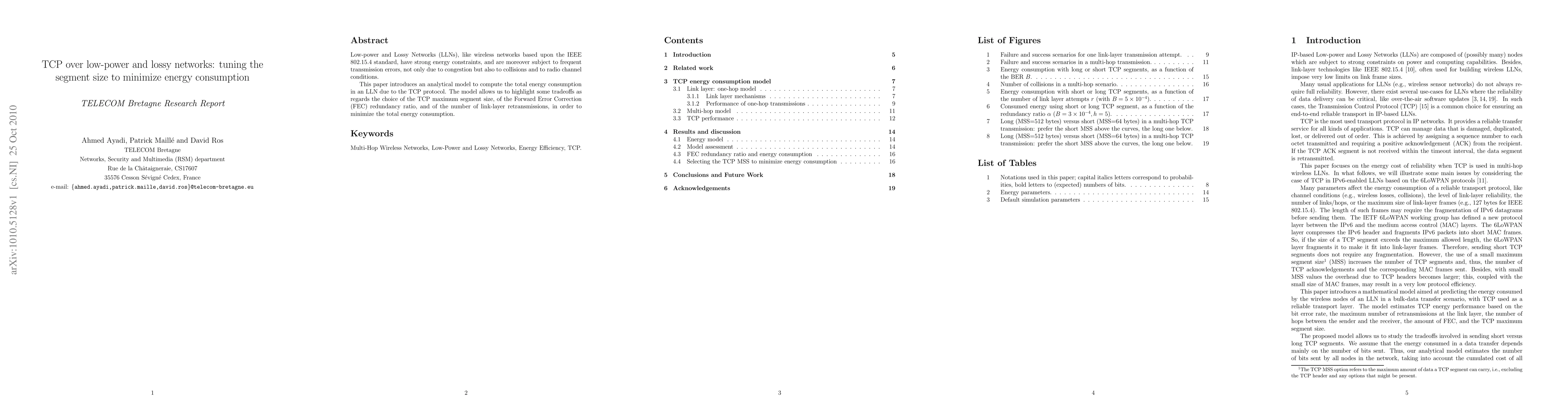 Low-power and Lossy Networks (LLNs), like wireless networks based upon the IEEE 802.15.4 standard, have strong energy constraints, and are moreover subject to frequent transmission errors, not only due to congestion but also to collisions and to radio channel conditions. This paper introduces an analytical model to compute the total energy consumption in an LLN due to the TCP protocol. The model allows us to highlight some tradeoffs as regards the choice of the TCP maximum segment size, of the Forward Error Correction (FEC) redundancy ratio, and of the number of link-layer retransmissions, in order to minimize the total energy consumption.