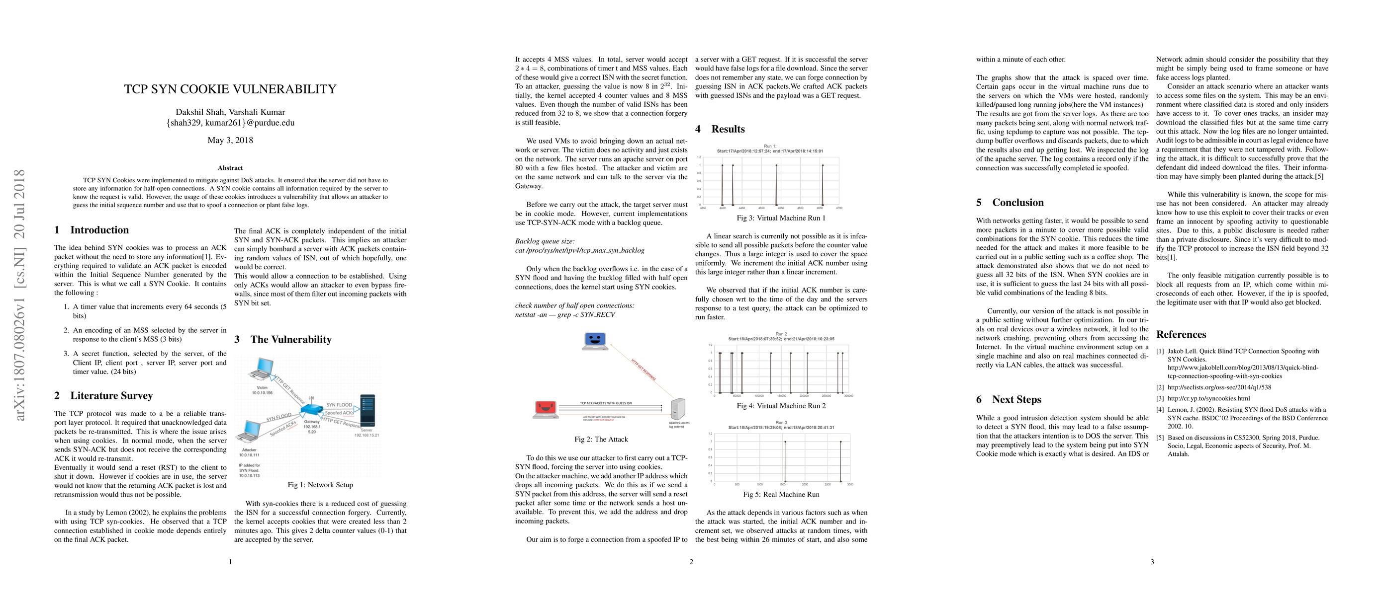 TCP SYN Cookies were implemented to mitigate against DoS attacks. It ensured that the server did not have to store any information for half-open connections. A SYN cookie contains all information required by the server to know the request is valid. However, the usage of these cookies introduces a vulnerability that allows an attacker to guess the initial sequence number and use that to spoof a connection or plant false logs.