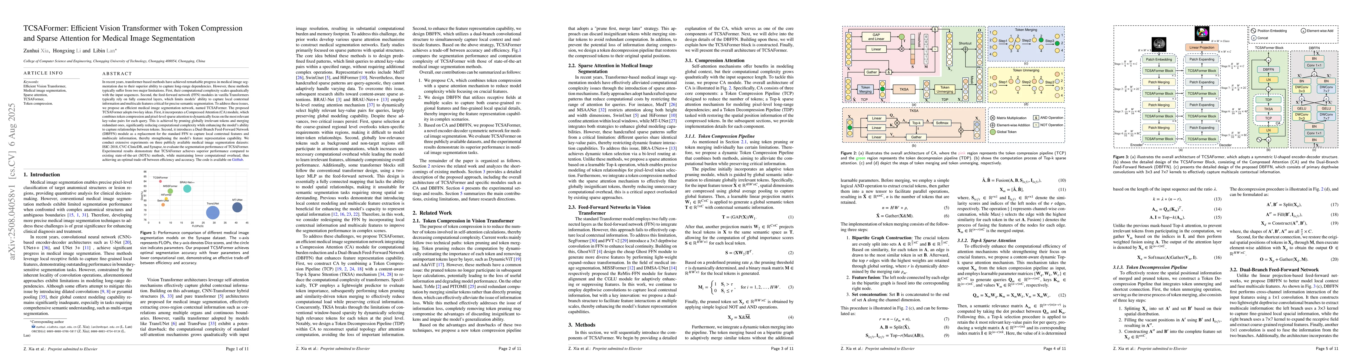 In recent years, transformer-based methods have achieved remarkable progress in medical image segmentation due to their superior ability to capture long-range dependencies. However, these methods typically suffer from two major limitations. First, their computational complexity scales quadratically with the input sequences. Second, the feed-forward network (FFN) modules in vanilla Transformers typically rely on fully connected layers, which limits models' ability to capture local contextual information and multiscale features critical for precise semantic segmentation. To address these issues, we propose an efficient medical image segmentation network, named TCSAFormer. The proposed TCSAFormer adopts two key ideas. First, it incorporates a Compressed Attention (CA) module, which combines token compression and pixel-level sparse attention to dynamically focus on the most relevant key-value pairs for each query. This is achieved by pruning globally irrelevant tokens and merging redundant ones, significantly reducing computational complexity while enhancing the model's ability to capture relationships between tokens. Second, it introduces a Dual-Branch Feed-Forward Network (DBFFN) module as a replacement for the standard FFN to capture local contextual features and multiscale information, thereby strengthening the model's feature representation capability. We conduct extensive experiments on three publicly available medical image segmentation datasets: ISIC-2018, CVC-ClinicDB, and Synapse, to evaluate the segmentation performance of TCSAFormer. Experimental results demonstrate that TCSAFormer achieves superior performance compared to existing state-of-the-art (SOTA) methods, while maintaining lower computational overhead, thus achieving an optimal trade-off between efficiency and accuracy.