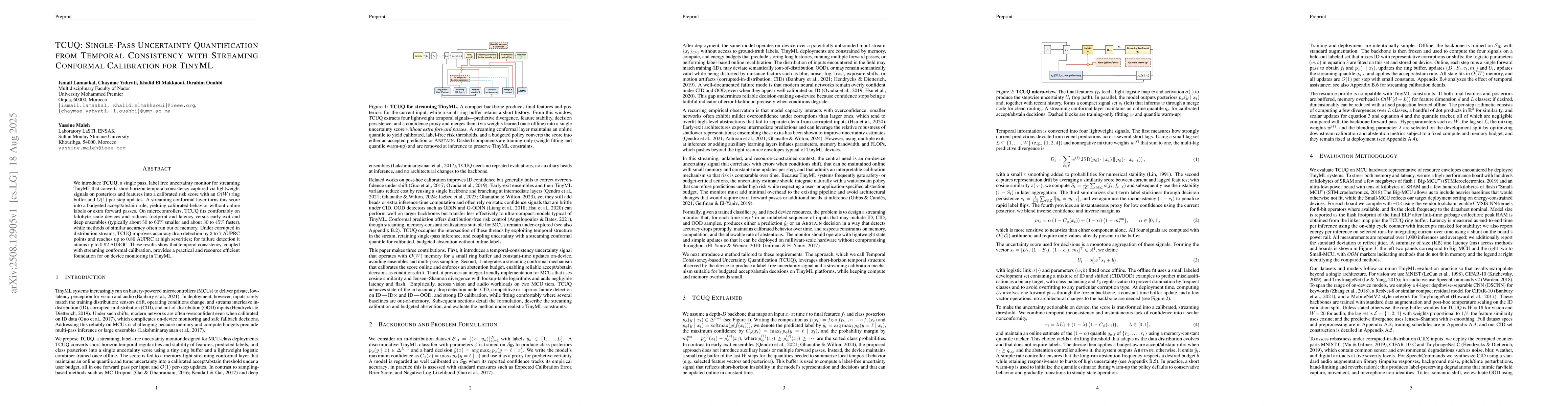 We introduce TCUQ, a single pass, label free uncertainty monitor for streaming TinyML that converts short horizon temporal consistency captured via lightweight signals on posteriors and features into a calibrated risk score with an O(W ) ring buffer and O(1) per step updates. A streaming conformal layer turns this score into a budgeted accept/abstain rule, yielding calibrated behavior without online labels or extra forward passes. On microcontrollers, TCUQ fits comfortably on kilobyte scale devices and reduces footprint and latency versus early exit and deep ensembles (typically about 50 to 60% smaller and about 30 to 45% faster), while methods of similar accuracy often run out of memory. Under corrupted in distribution streams, TCUQ improves accuracy drop detection by 3 to 7 AUPRC points and reaches up to 0.86 AUPRC at high severities; for failure detection it attains up to 0.92 AUROC. These results show that temporal consistency, coupled with streaming conformal calibration, provides a practical and resource efficient foundation for on device monitoring in TinyML.