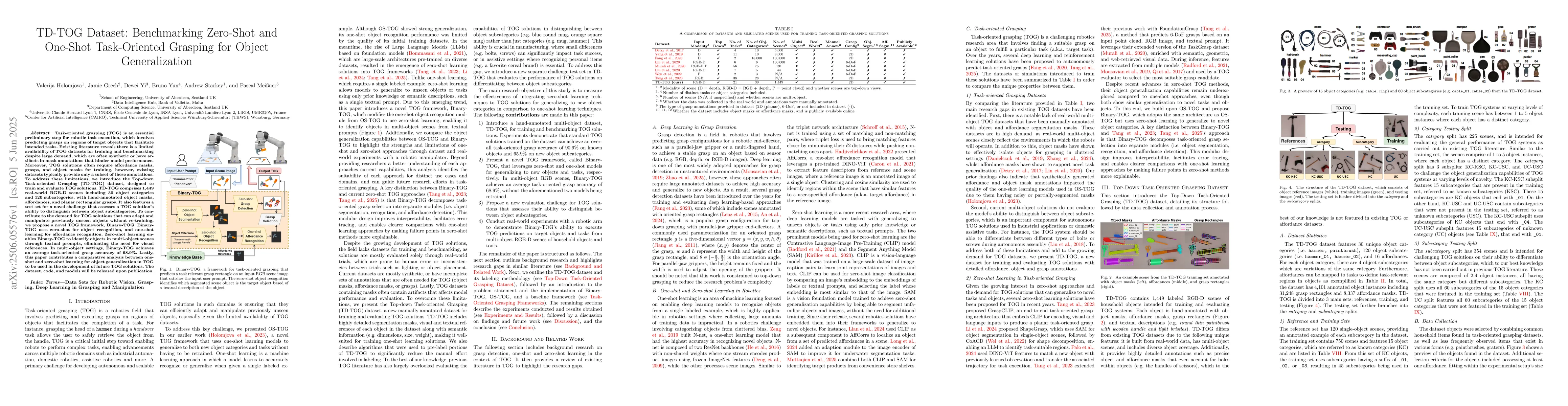 The TD-TOG dataset provides a benchmark for zero-shot and one-shot task-oriented grasping solutions, addressing the limited availability of real-world datasets with accurate annotations. A novel TOG framework, Binary-TOG, achieves high accuracy in multi-object scenes using zero-shot learning and one-shot affordance recognition.