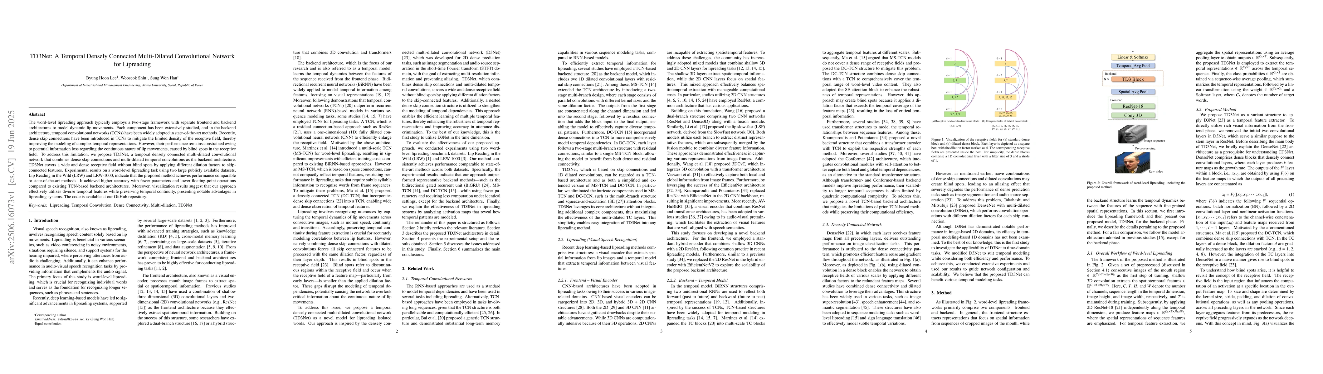 The paper introduces TD3Net, a novel temporal densely connected multi-dilated convolutional network for word-level lipreading. TD3Net combines dense skip connections and multi-dilated temporal convolutions to cover a wide receptive field without blind spots, improving temporal representation modeling. It outperforms existing TCN-based architectures with fewer parameters and operations, demonstrating effectiveness in capturing diverse temporal features while preserving continuity in lip movements.