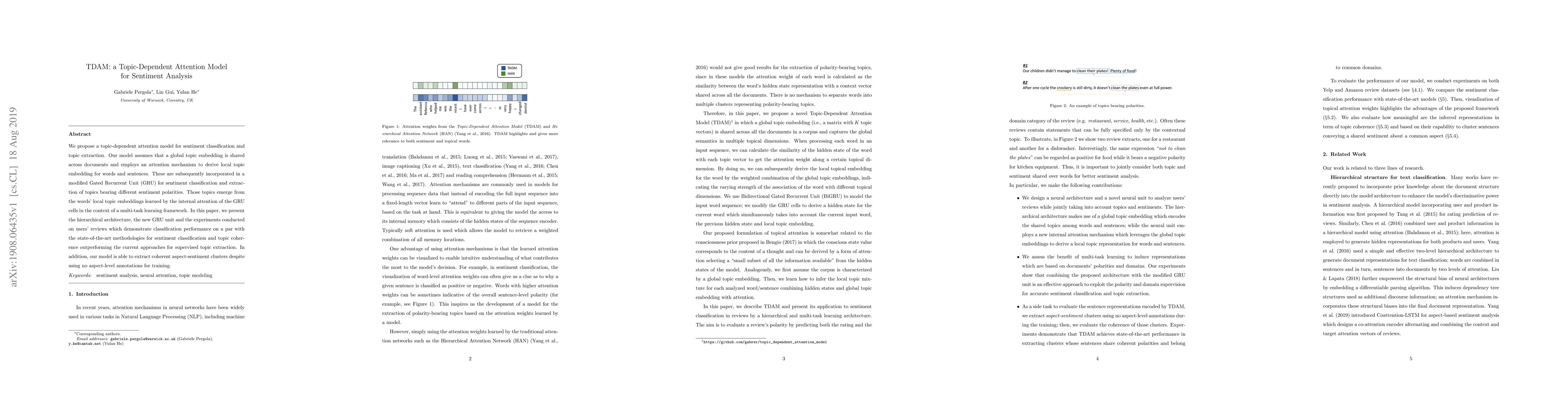 The paper introduces TDAM, a topic-dependent attention model for sentiment analysis that uses a shared global topic embedding and attention mechanisms to derive local topic embeddings for words and sentences. The model achieves competitive sentiment classification and topic extraction performance, outperforming current methods and extracting coherent aspect-sentiment clusters without aspect-level annotations.