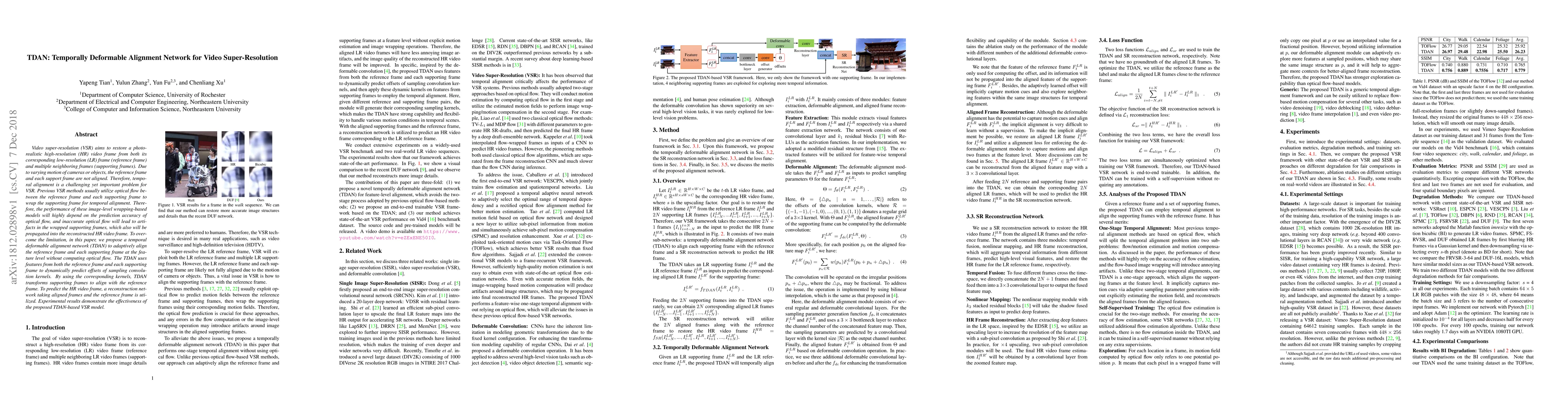 The paper proposes a Temporally Deformable Alignment Network (TDAN) for video super-resolution, which aligns reference and supporting frames at the feature level without optical flow, using deformable convolution kernels to mitigate artifacts. Experimental results show improved performance over traditional methods.